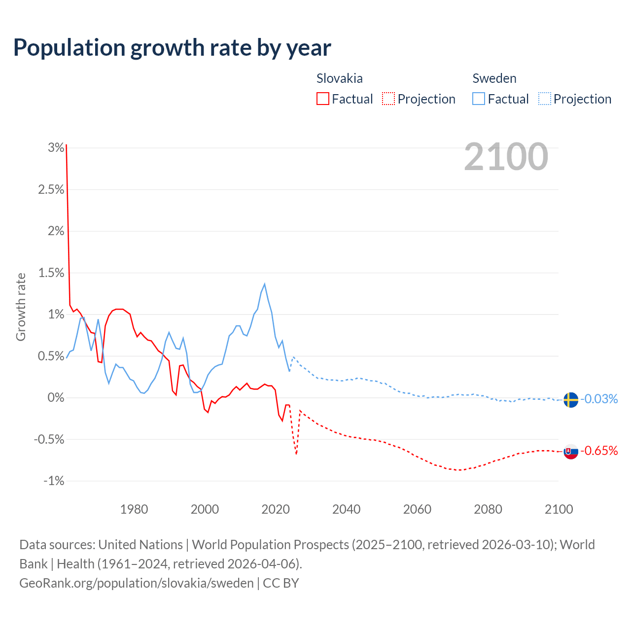 - For the last 10 years, Slovakia has had an average growth rate of +0.01% per year vs +0.88% in Sweden.
