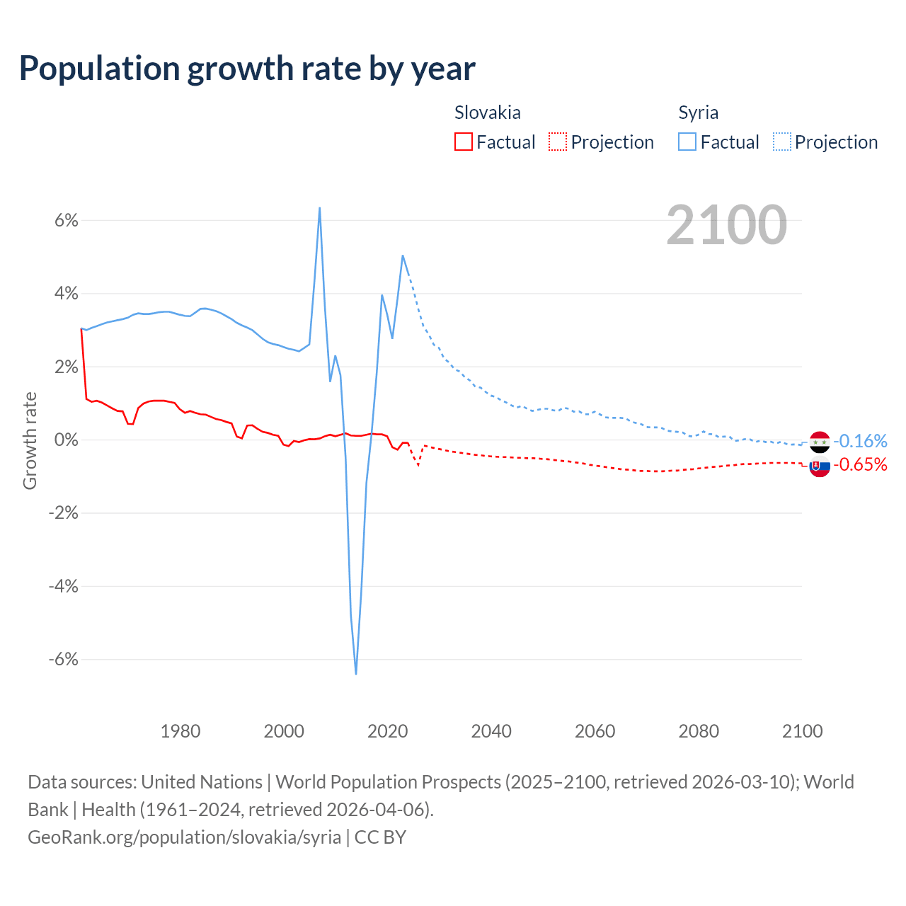 - For the last 10 years, Slovakia has had an average growth rate of +0.01% per year vs +1.25% in Syria.