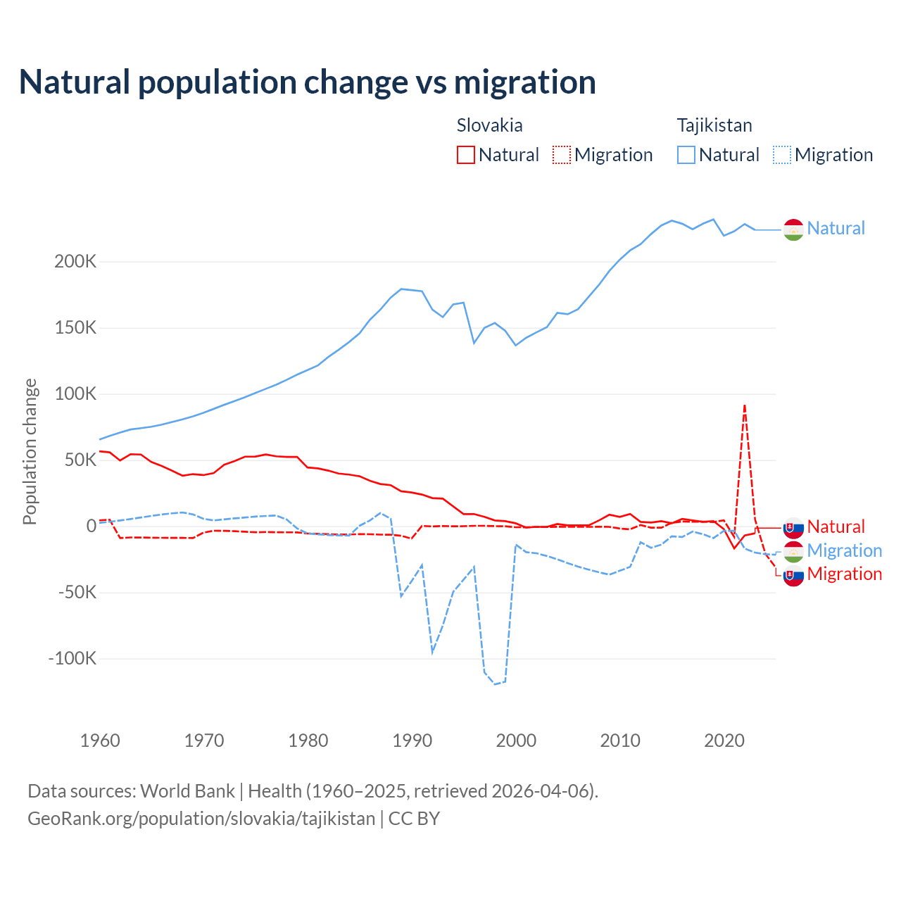 Over the last 10 years, 7.47% of the population change in Slovakia is from natural causes (a loss of 8,728 people) and 92.5% is from migration (a gain of 108,156 people). In Tajikistan 96% is from natural causes (a gain of 2,266,045 people) and 3.95% is from migration (a loss of 93,205 people).