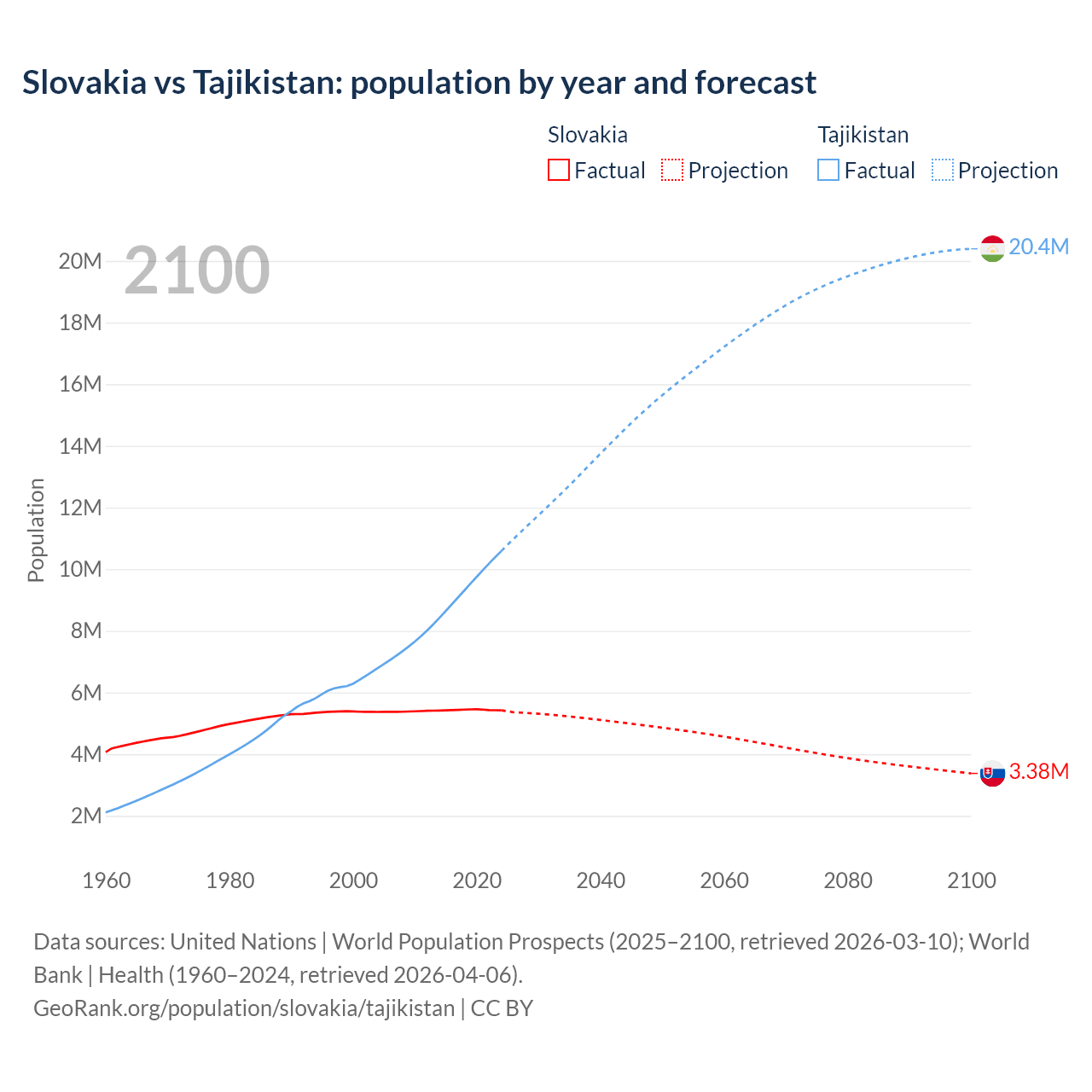 The latest officially reported population of Slovakia was 5,422,069 in 2024 vs 10,590,927 people in Tajikistan in 2024. In 2026, based on the adjusted UN estimation, the current Slovakia's population is 5,359,438 people compared to 11,038,274 in Tajikistan.