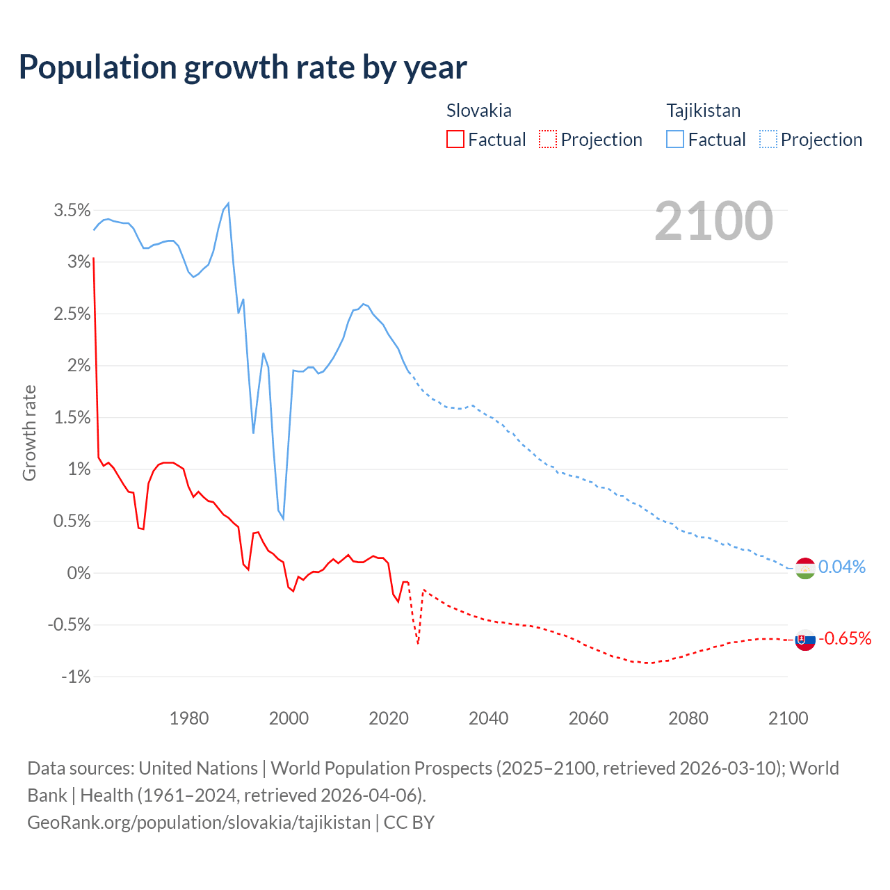 - For the last 10 years, Slovakia has had an average growth rate of +0.01% per year vs +2.33% in Tajikistan.