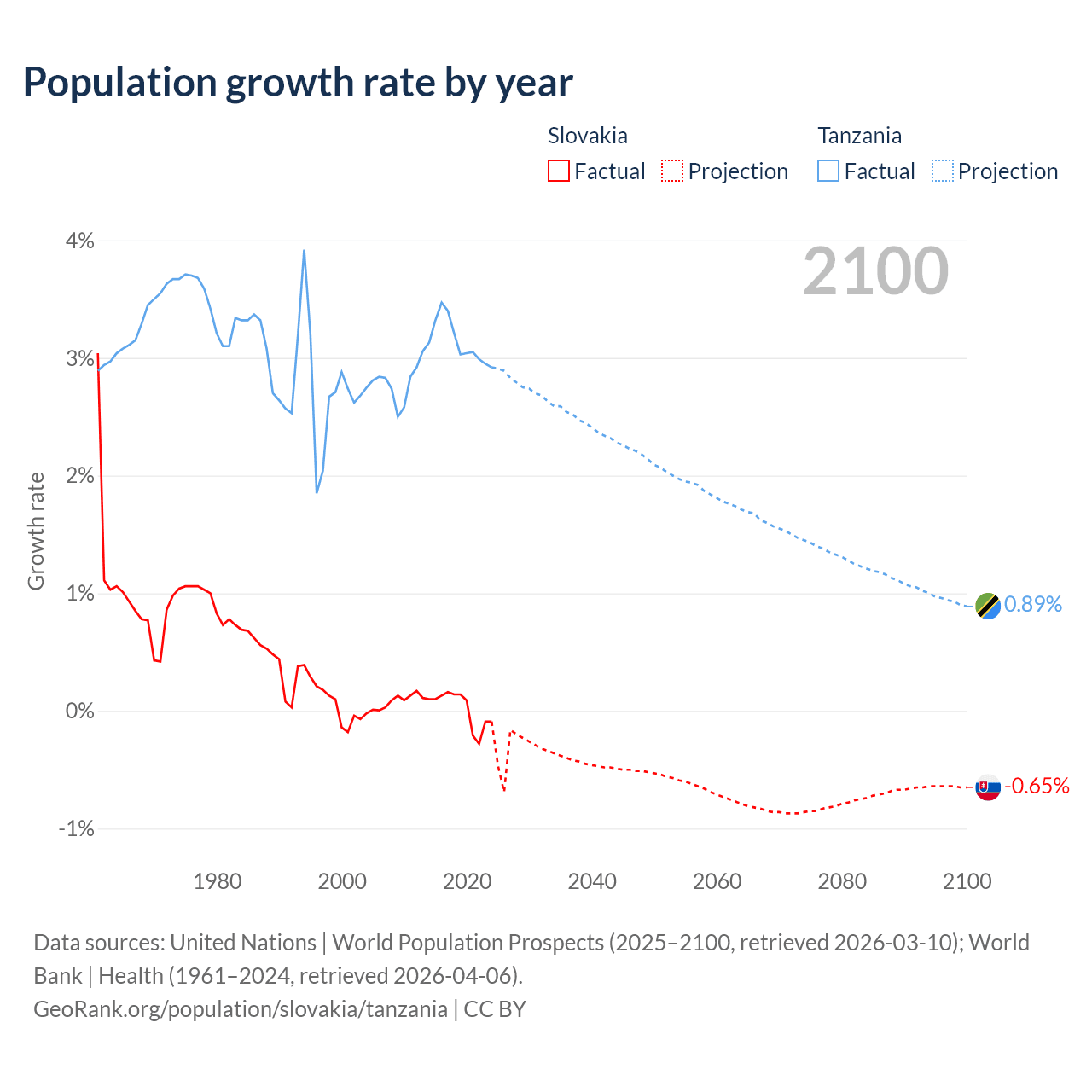 - For the last 10 years, Slovakia has had an average growth rate of +0.01% per year vs +3.13% in Tanzania.