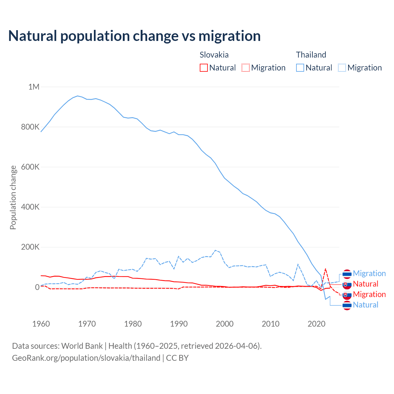 Over the last 10 years, 7.47% of the population change in Slovakia is from natural causes (a loss of 8,728 people) and 92.5% is from migration (a gain of 108,156 people). In Thailand 78.4% is from natural causes (a gain of 1,292,528 people) and 21.6% is from migration (a gain of 355,361 people).