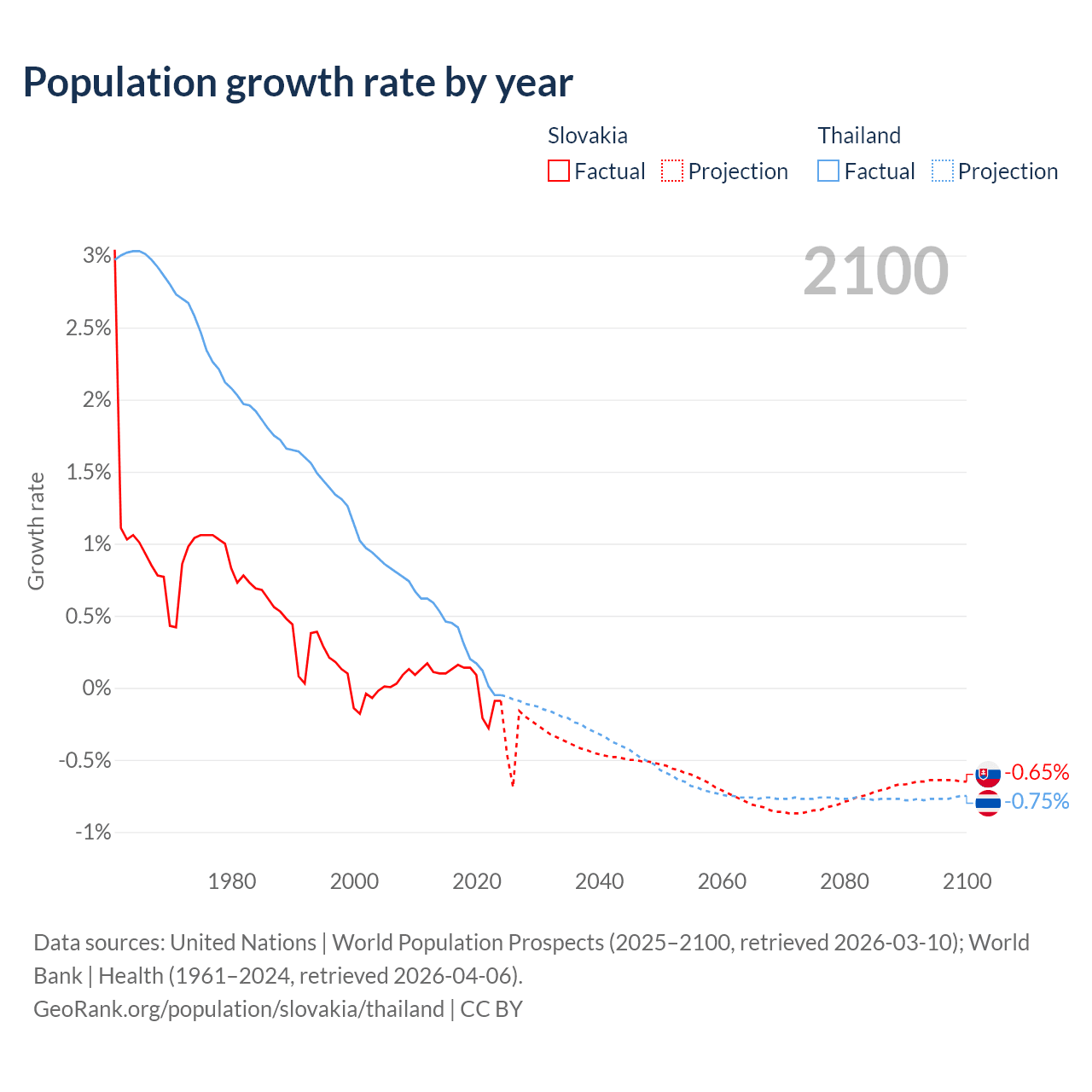 - For the last 10 years, Slovakia has had an average growth rate of +0.01% per year vs +0.23% in Thailand.