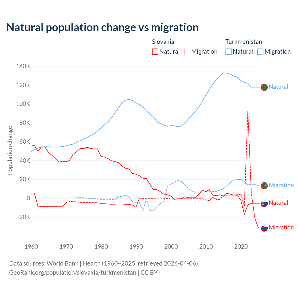 Over the last 10 years, 7.47% of the population change in Slovakia is from natural causes (a loss of 8,728 people) and 92.5% is from migration (a gain of 108,156 people). In Turkmenistan 89.2% is from natural causes (a gain of 1,270,228 people) and 10.8% is from migration (a gain of 154,379 people).
