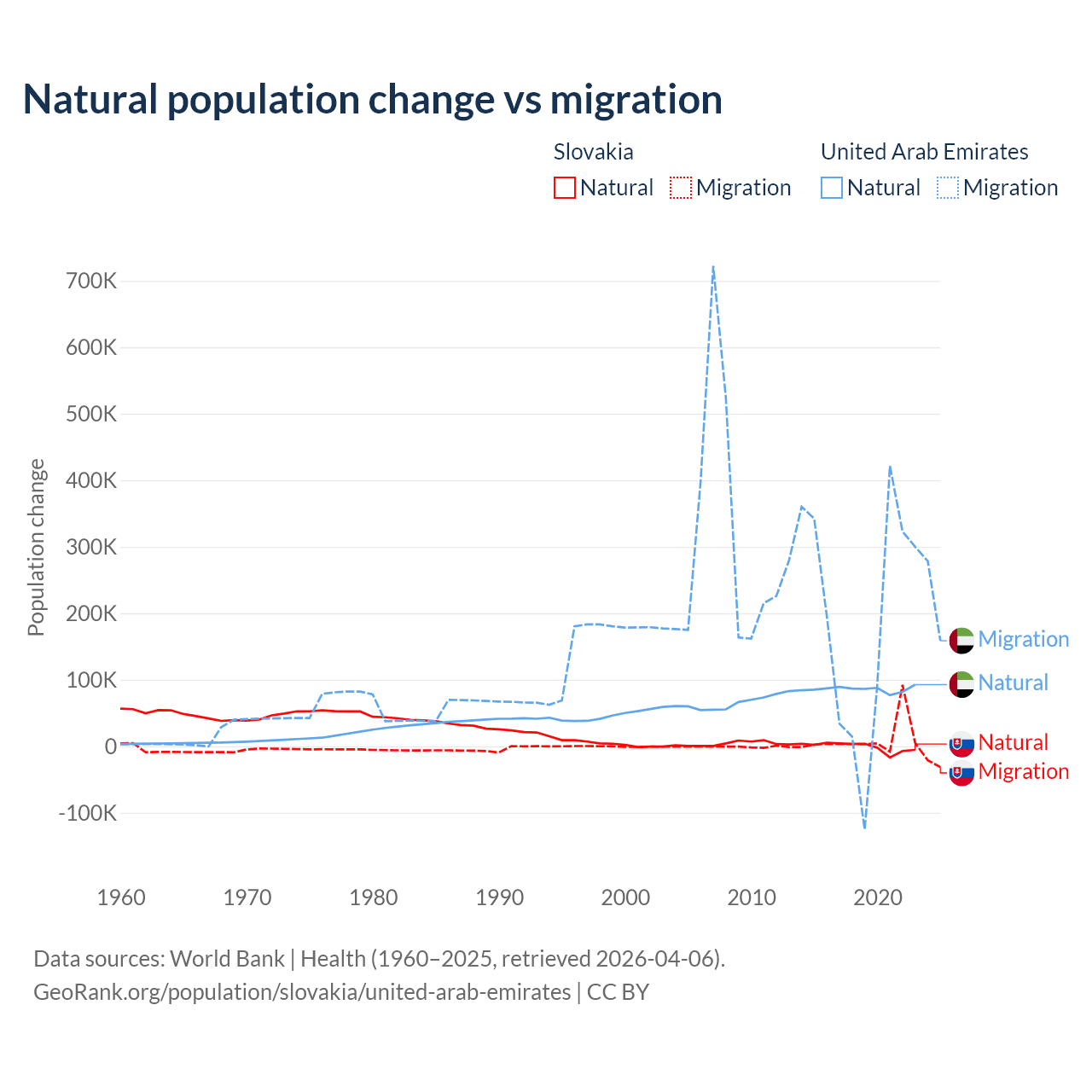 Over the last 10 years, 7.47% of the population change in Slovakia is from natural causes (a loss of 8,728 people) and 92.5% is from migration (a gain of 108,156 people). In the United Arab Emirates 30.5% is from natural causes (a gain of 857,996 people) and 69.5% is from migration (a gain of 1,958,520 people).