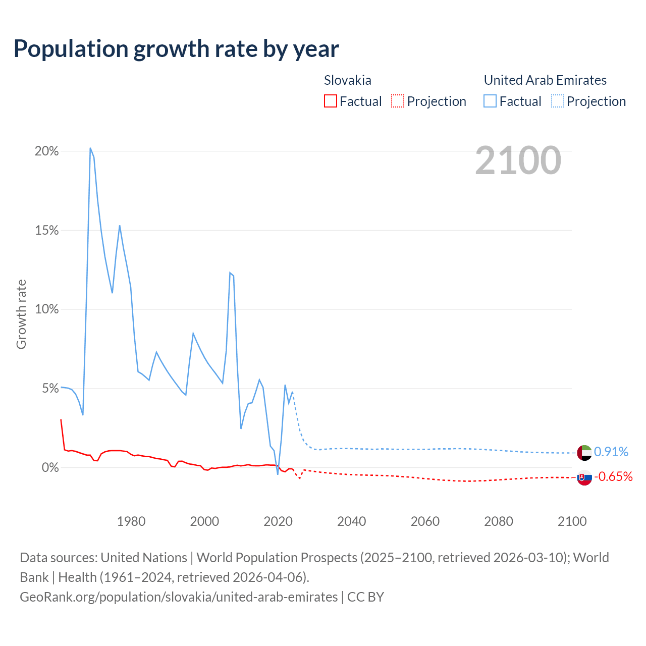 - For the last 10 years, Slovakia has had an average growth rate of +0.01% per year vs +3.31% in the United Arab Emirates.