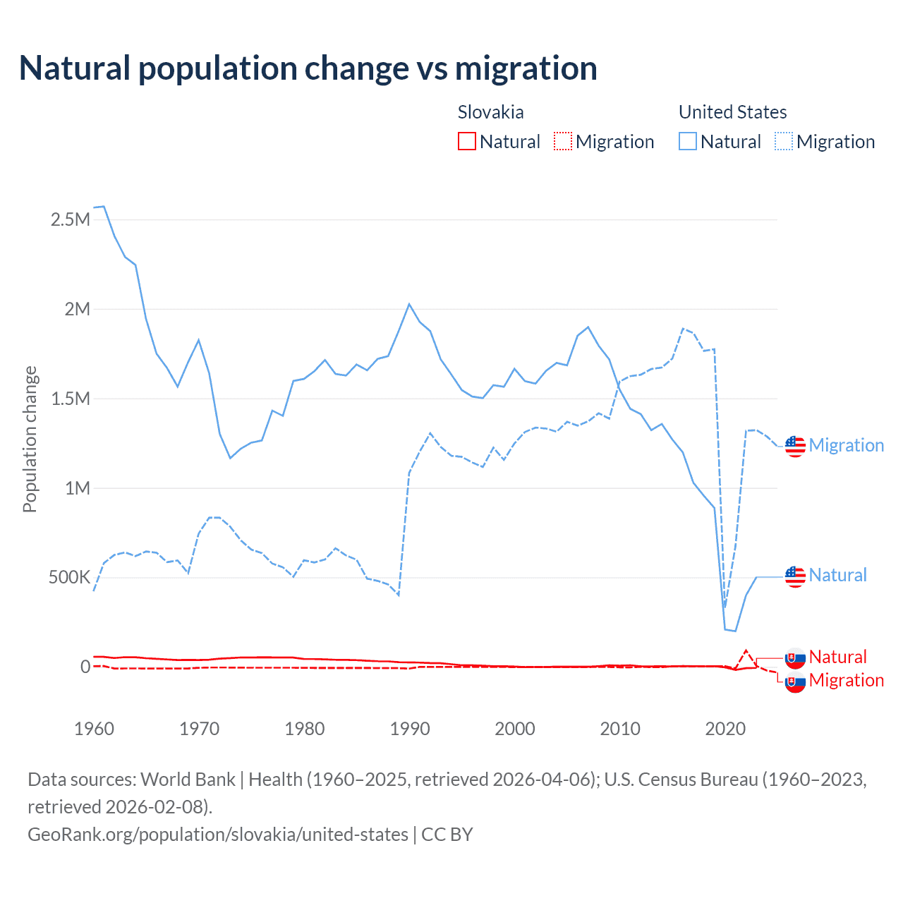 Over the last 10 years, 7.47% of the population change in Slovakia is from natural causes (a loss of 8,728 people) and 92.5% is from migration (a gain of 108,156 people). In the United States 35.8% is from natural causes (a gain of 8,005,866 people) and 64.2% is from migration (a gain of 14,334,286 people).