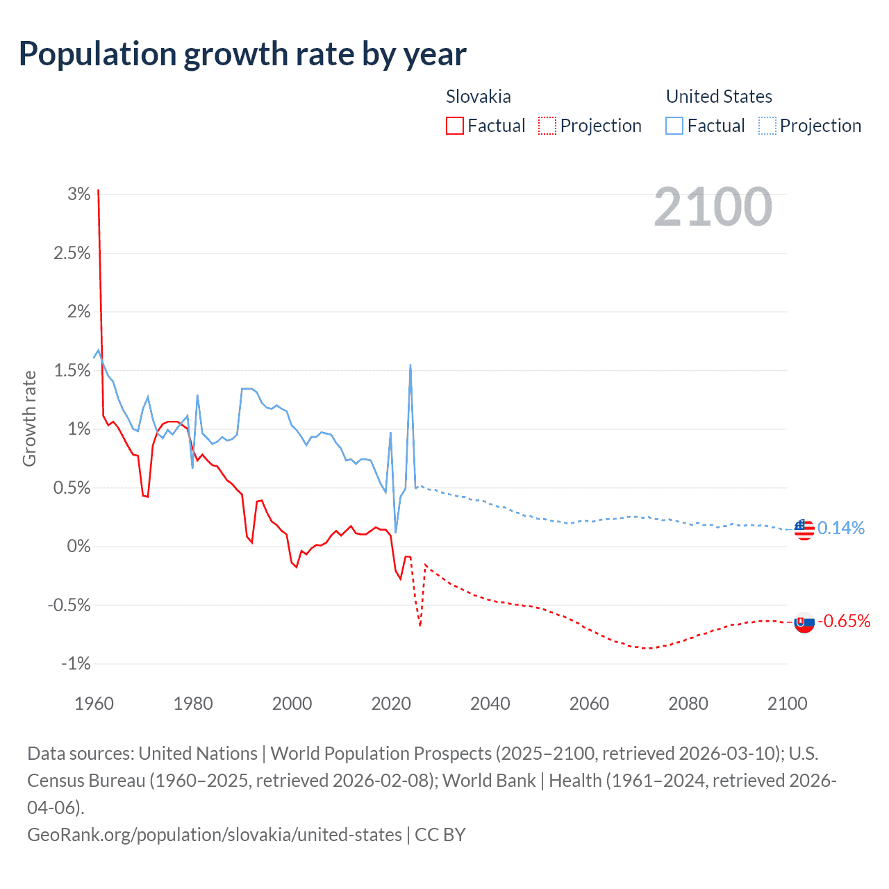 Data sources: World Bank | Health (1960–2024, retrieved 2026-04-06); United Nations | World Population Prospects (1960–2026, retrieved 2026-03-10); U.S. Census Bureau (1960–2025, retrieved 2026-02-08); Central Intelligence Agency (CIA) (2000–2019, retrieved 2026-02-20).