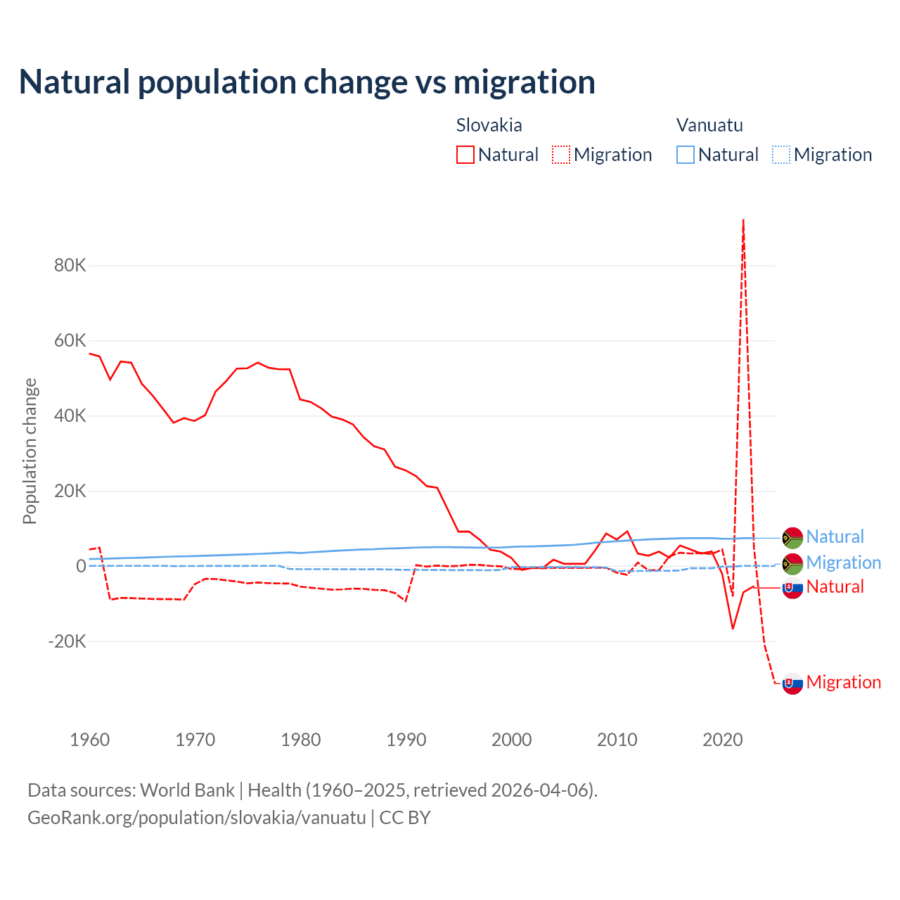 Over the last 10 years, 7.47% of the population change in Slovakia is from natural causes (a loss of 8,728 people) and 92.5% is from migration (a gain of 108,156 people). In Vanuatu 92.2% is from natural causes (a gain of 72,941 people) and 7.81% is from migration (a loss of 6,181 people).