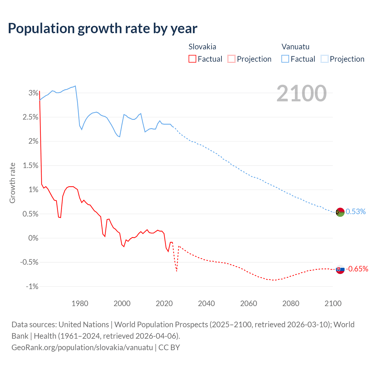- For the last 10 years, Slovakia has had an average growth rate of +0.01% per year vs +2.33% in Vanuatu.