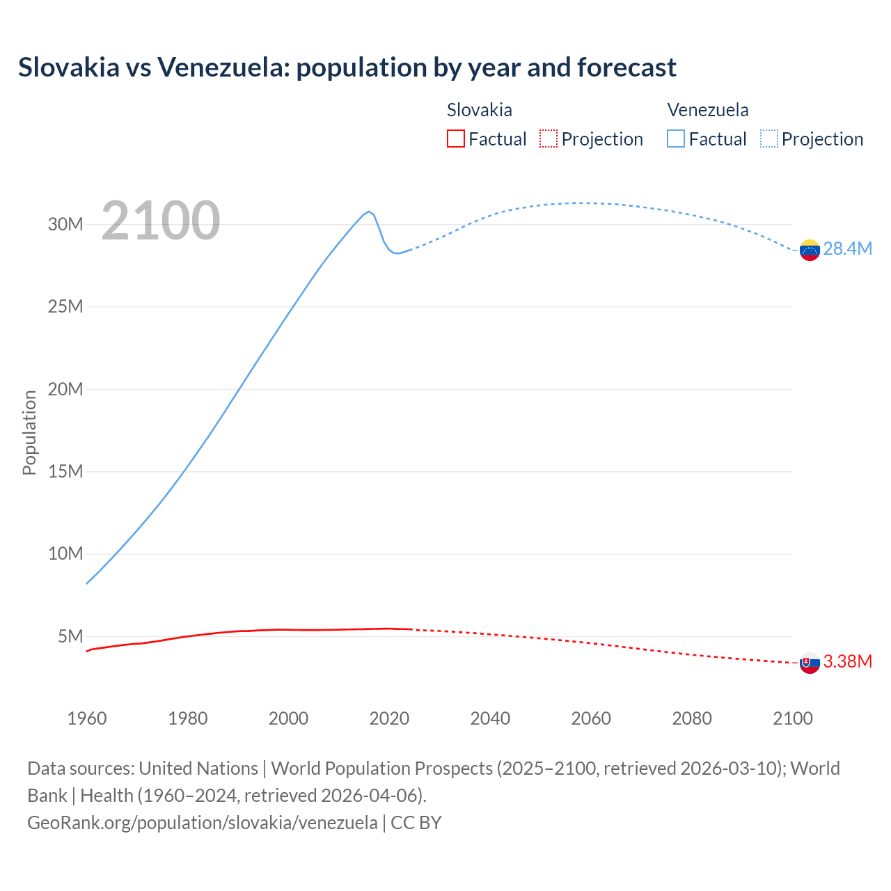 The latest officially reported population of Slovakia was 5,422,069 in 2024 vs 28,405,543 people in Venezuela in 2024. In 2026, based on the adjusted UN estimation, the current Slovakia's population is 5,359,438 people compared to 28,661,242 in Venezuela.