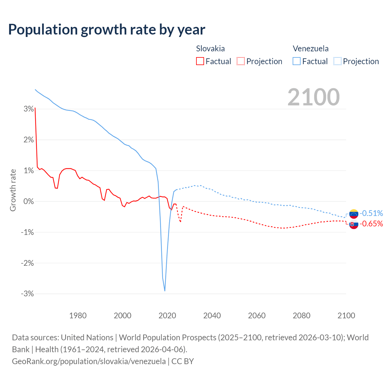 - For the last 10 years, Slovakia has had an average growth rate of +0.01% per year vs -0.46% in Venezuela.