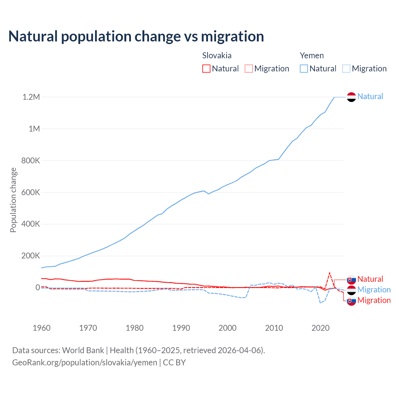 Over the last 10 years, 7.47% of the population change in Slovakia is from natural causes (a loss of 8,728 people) and 92.5% is from migration (a gain of 108,156 people). In Yemen 97.8% is from natural causes (a gain of 10,460,813 people) and 2.17% is from migration (a loss of 231,814 people).