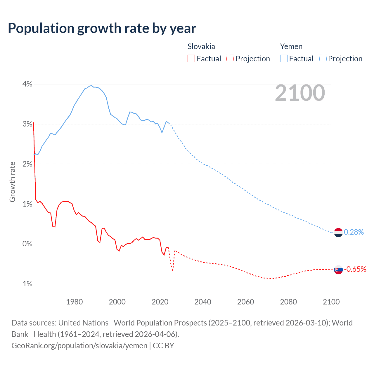 - For the last 10 years, Slovakia has had an average growth rate of +0.01% per year vs +3% in Yemen.