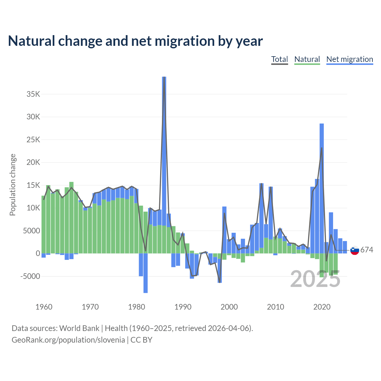 Over the last 10 years, 18.1% of the population change in Slovenia is from natural causes (a loss of 17,573 people) and 81.9% is from migration (a gain of 79,532 people).