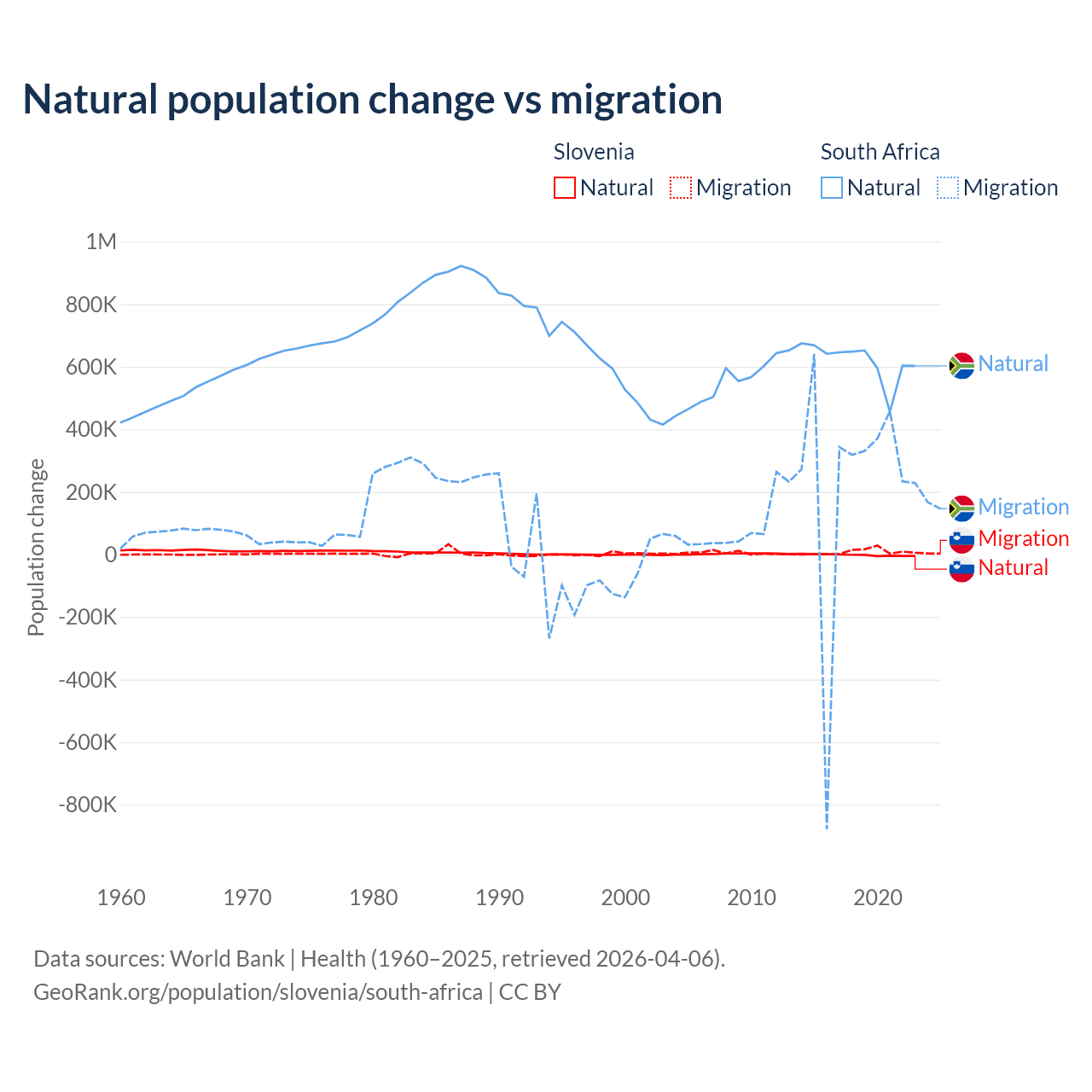 Over the last 10 years, 18.1% of the population change in Slovenia is from natural causes (a loss of 17,573 people) and 81.9% is from migration (a gain of 79,532 people). In South Africa 72.8% is from natural causes (a gain of 6,190,027 people) and 27.2% is from migration (a gain of 2,316,795 people).
