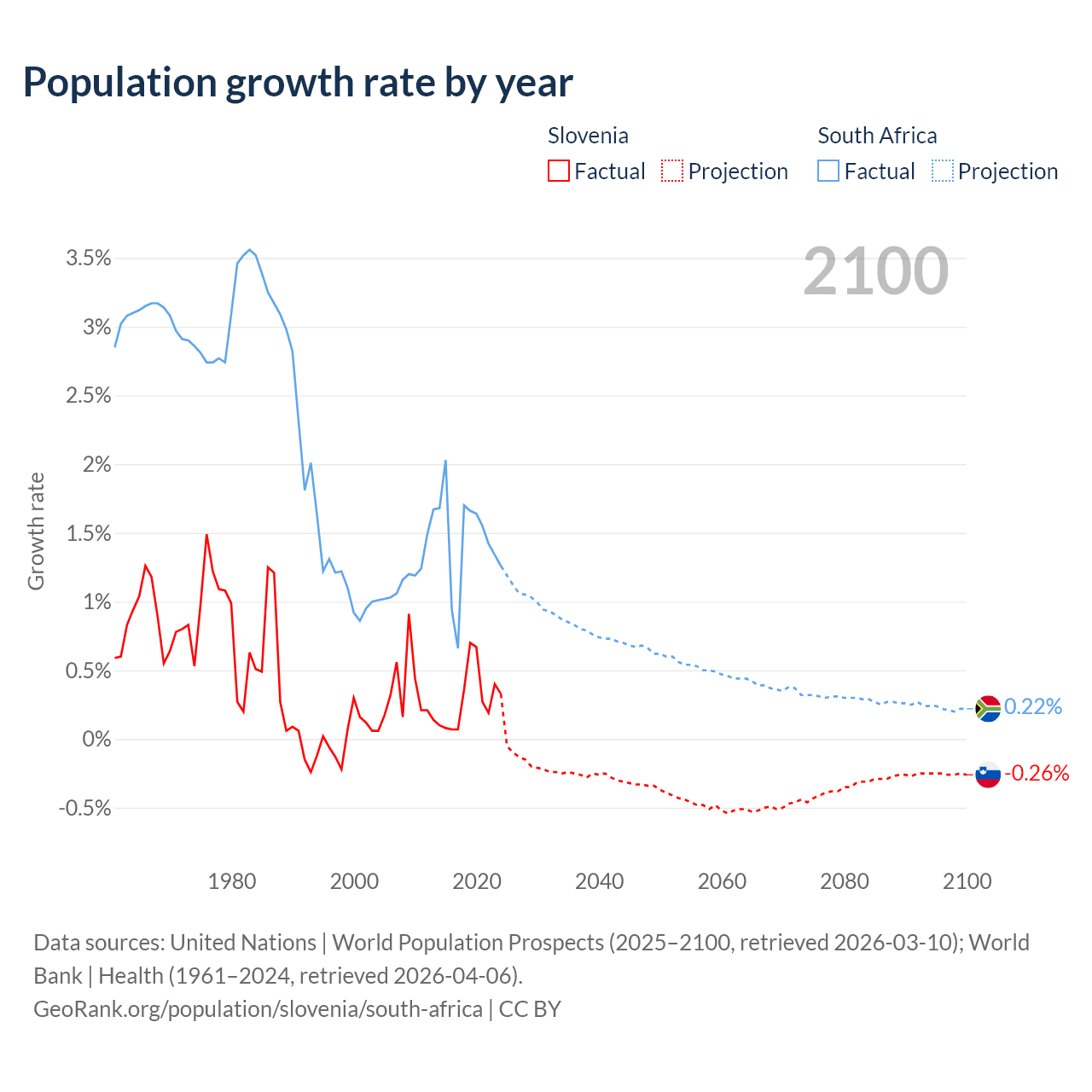 - For the last 10 years, Slovenia has had an average growth rate of +0.29% per year vs +1.44% in South Africa.