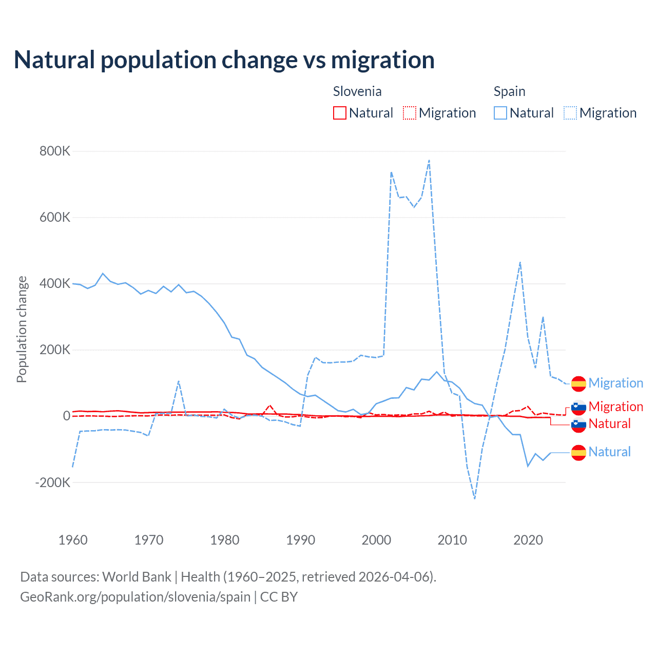 Over the last 10 years, 18.1% of the population change in Slovenia is from natural causes (a loss of 17,573 people) and 81.9% is from migration (a gain of 79,532 people). In Spain 25.8% is from natural causes (a loss of 627,829 people) and 74.2% is from migration (a gain of 1,810,127 people).