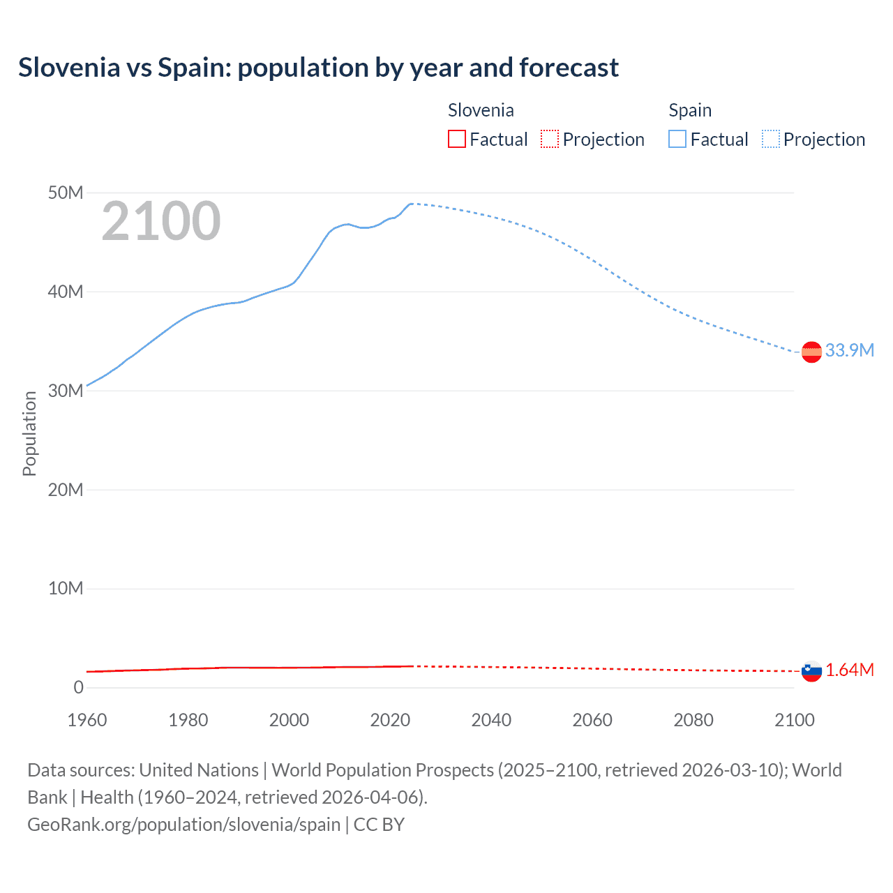 Slovenia vs Spain: population by year and forecast