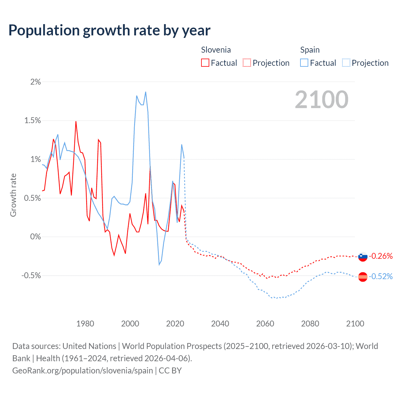 - For the last 10 years, Slovenia has had an average growth rate of +0.29% per year vs +0.43% in Spain.