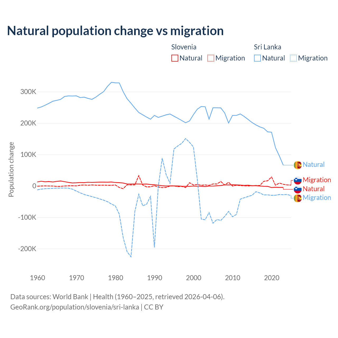 Over the last 10 years, 18.1% of the population change in Slovenia is from natural causes (a loss of 17,573 people) and 81.9% is from migration (a gain of 79,532 people). In Sri Lanka 85.3% is from natural causes (a gain of 1,605,749 people) and 14.7% is from migration (a loss of 276,121 people).