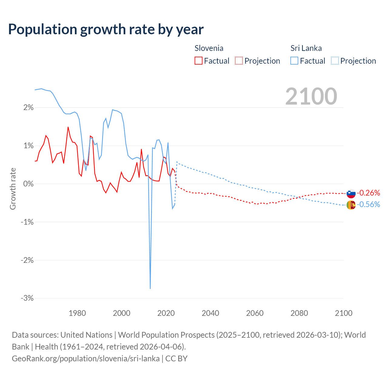 Slovenia vs Sri Lanka: population by year and forecast