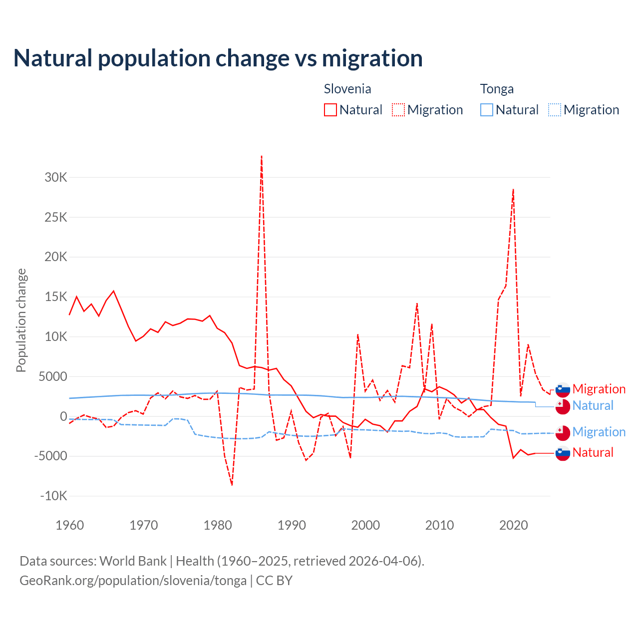 Over the last 10 years, 18.1% of the population change in Slovenia is from natural causes (a loss of 17,573 people) and 81.9% is from migration (a gain of 79,532 people). In Tonga 46.9% is from natural causes (a gain of 18,919 people) and 53.1% is from migration (a loss of 21,384 people).