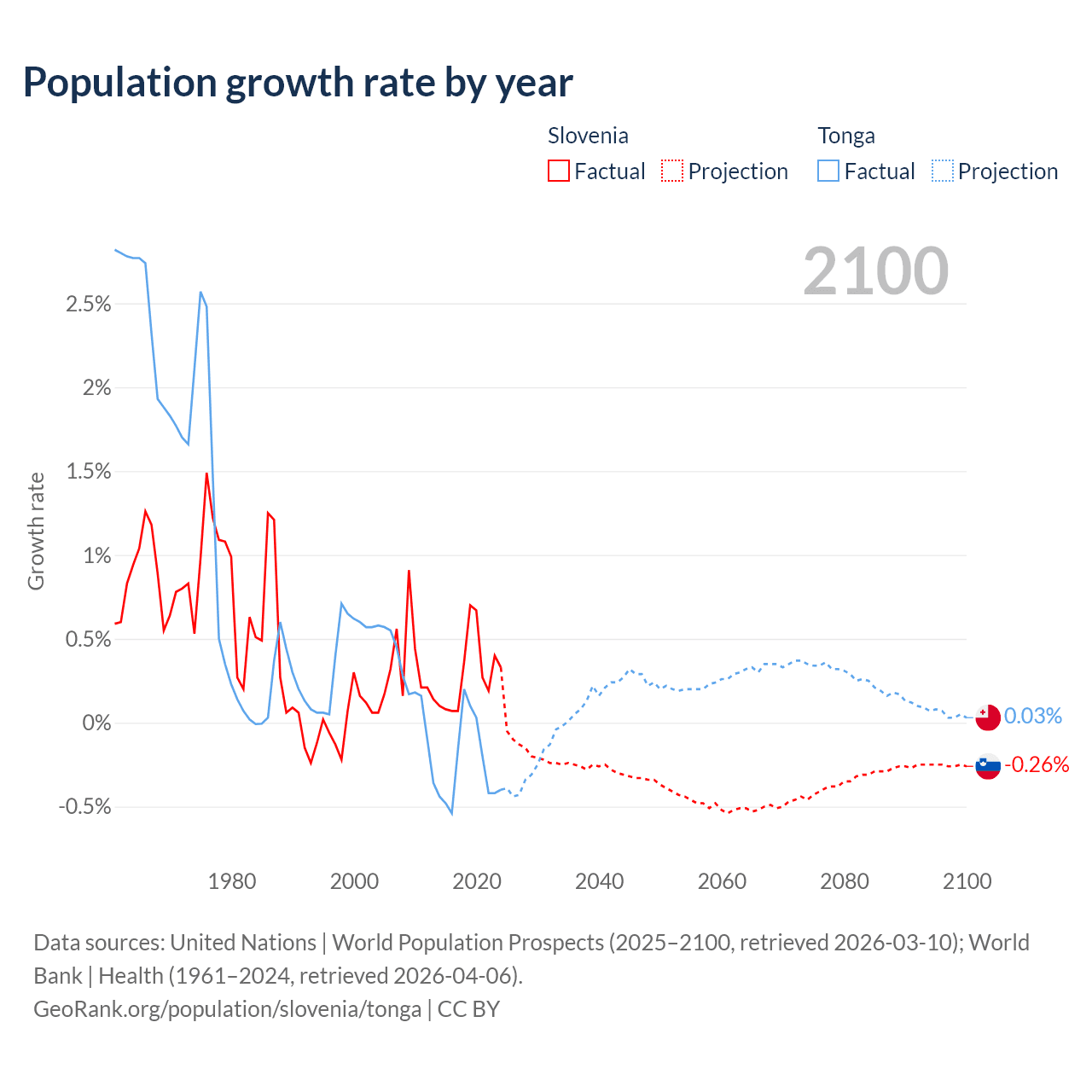 - For the last 10 years, Slovenia has had an average growth rate of +0.29% per year vs -0.25% in Tonga.