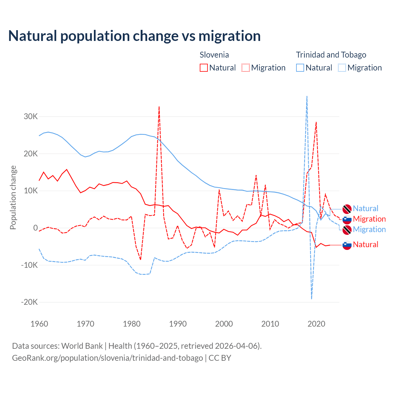 Over the last 10 years, 18.1% of the population change in Slovenia is from natural causes (a loss of 17,573 people) and 81.9% is from migration (a gain of 79,532 people). In Trinidad and Tobago 66% is from natural causes (a gain of 55,887 people) and 34% is from migration (a gain of 28,785 people).