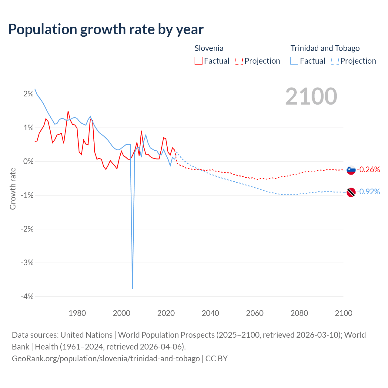 - For the last 10 years, Slovenia has had an average growth rate of +0.29% per year vs +0.19% in Trinidad and Tobago.