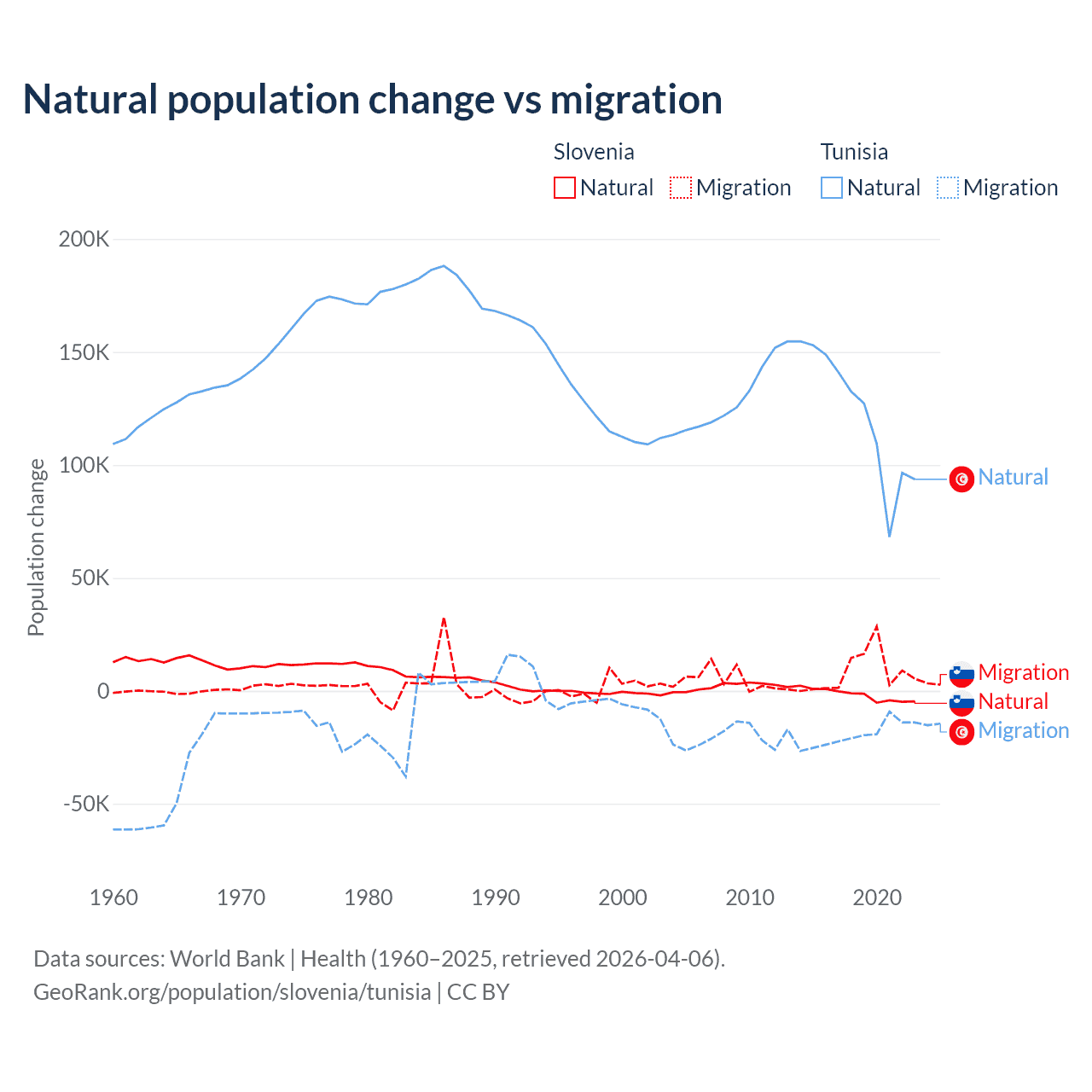 Over the last 10 years, 18.1% of the population change in Slovenia is from natural causes (a loss of 17,573 people) and 81.9% is from migration (a gain of 79,532 people). In Tunisia 86.3% is from natural causes (a gain of 1,225,079 people) and 13.7% is from migration (a loss of 195,011 people).