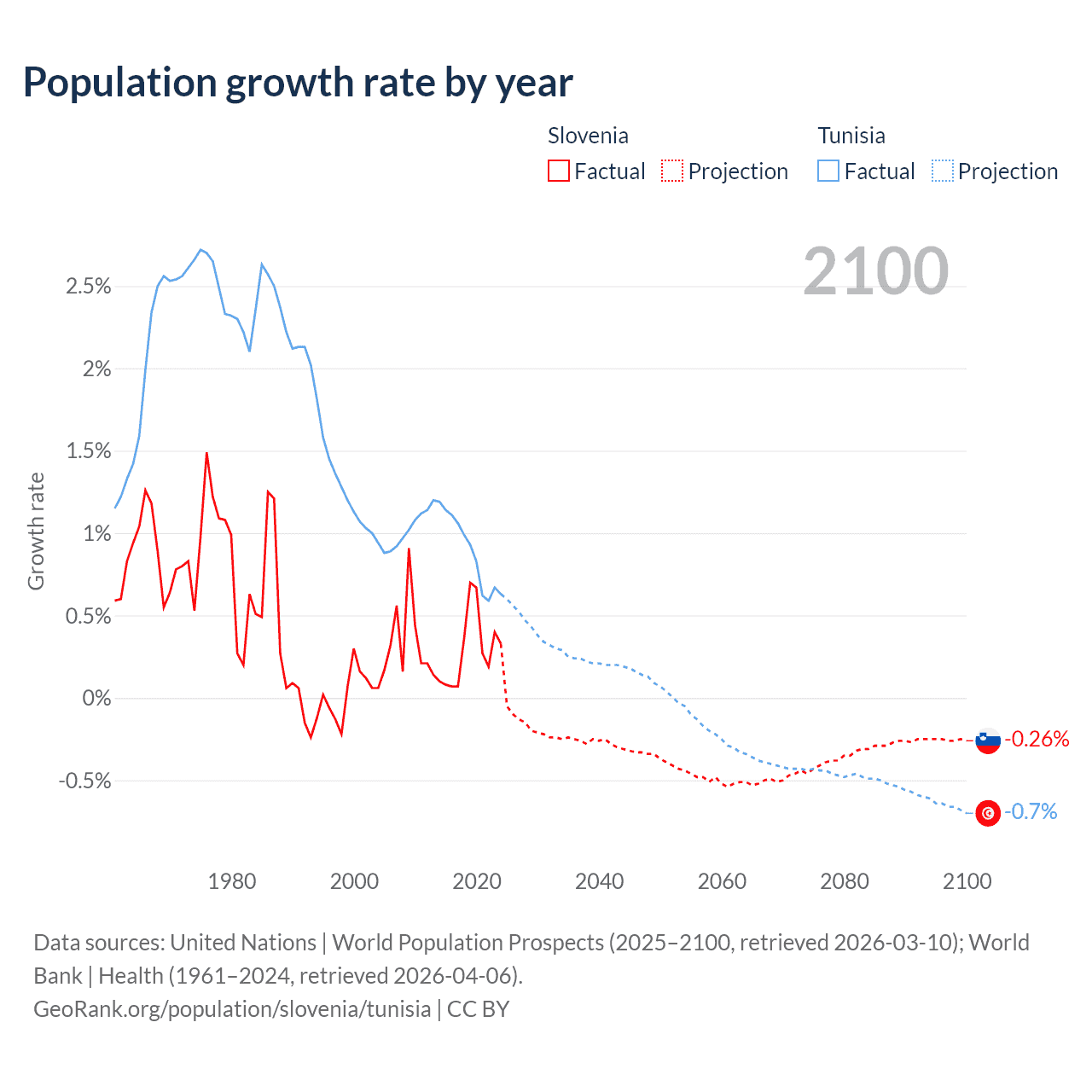 - For the last 10 years, Slovenia has had an average growth rate of +0.29% per year vs +0.89% in Tunisia.
