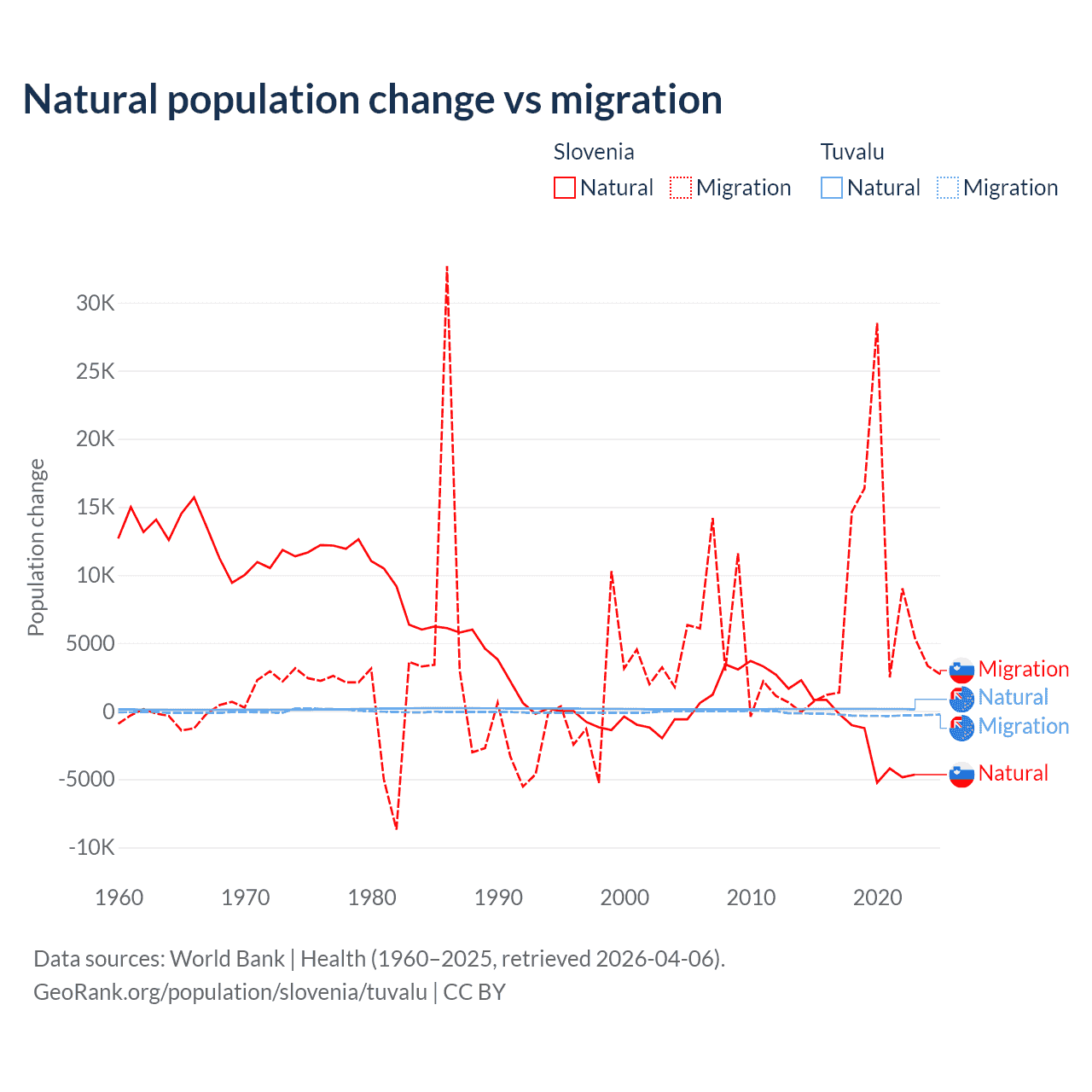 Over the last 10 years, 18.1% of the population change in Slovenia is from natural causes (a loss of 17,573 people) and 81.9% is from migration (a gain of 79,532 people). In Tuvalu 35.5% is from natural causes (a gain of 1,556 people) and 64.5% is from migration (a loss of 2,827 people).