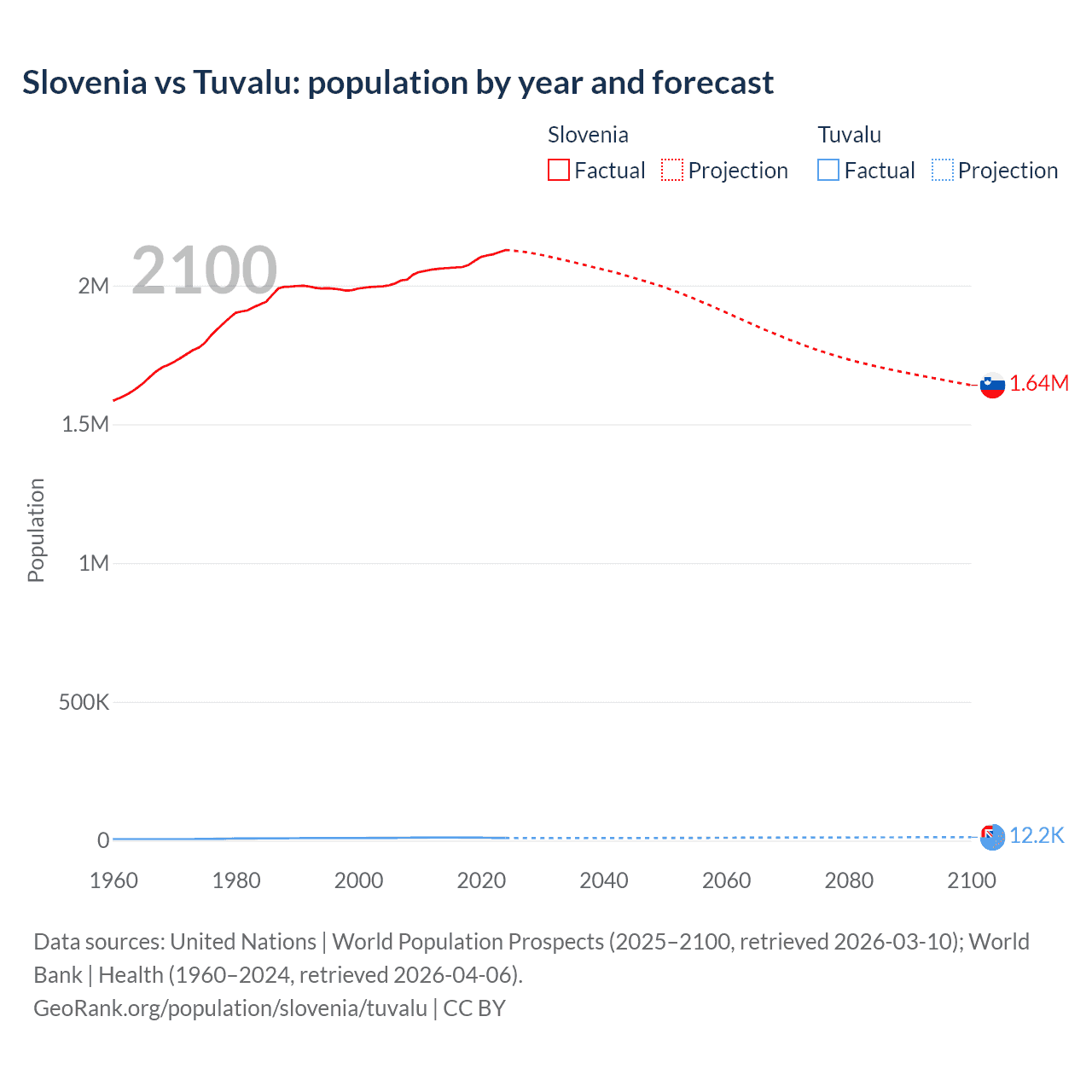 The latest officially reported population of Slovenia was 2,127,400 in 2024 vs 9,646 people in Tuvalu in 2024. In 2026, based on the adjusted UN estimation, the current Slovenia's population is 2,124,138 people compared to 9,341 in Tuvalu.