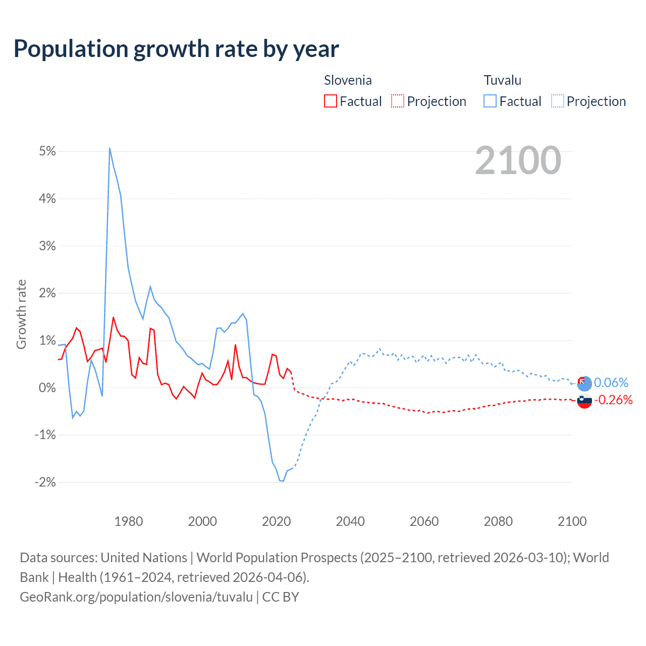 - For the last 10 years, Slovenia has had an average growth rate of +0.29% per year vs -1.19% in Tuvalu.
