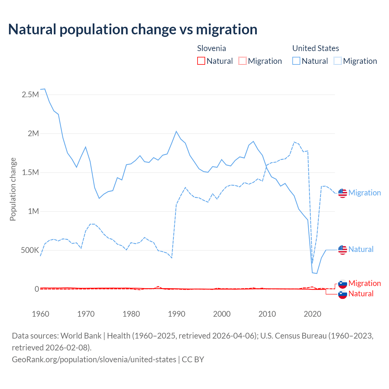 Over the last 10 years, 18.1% of the population change in Slovenia is from natural causes (a loss of 17,573 people) and 81.9% is from migration (a gain of 79,532 people). In the United States 35.8% is from natural causes (a gain of 8,005,866 people) and 64.2% is from migration (a gain of 14,334,286 people).