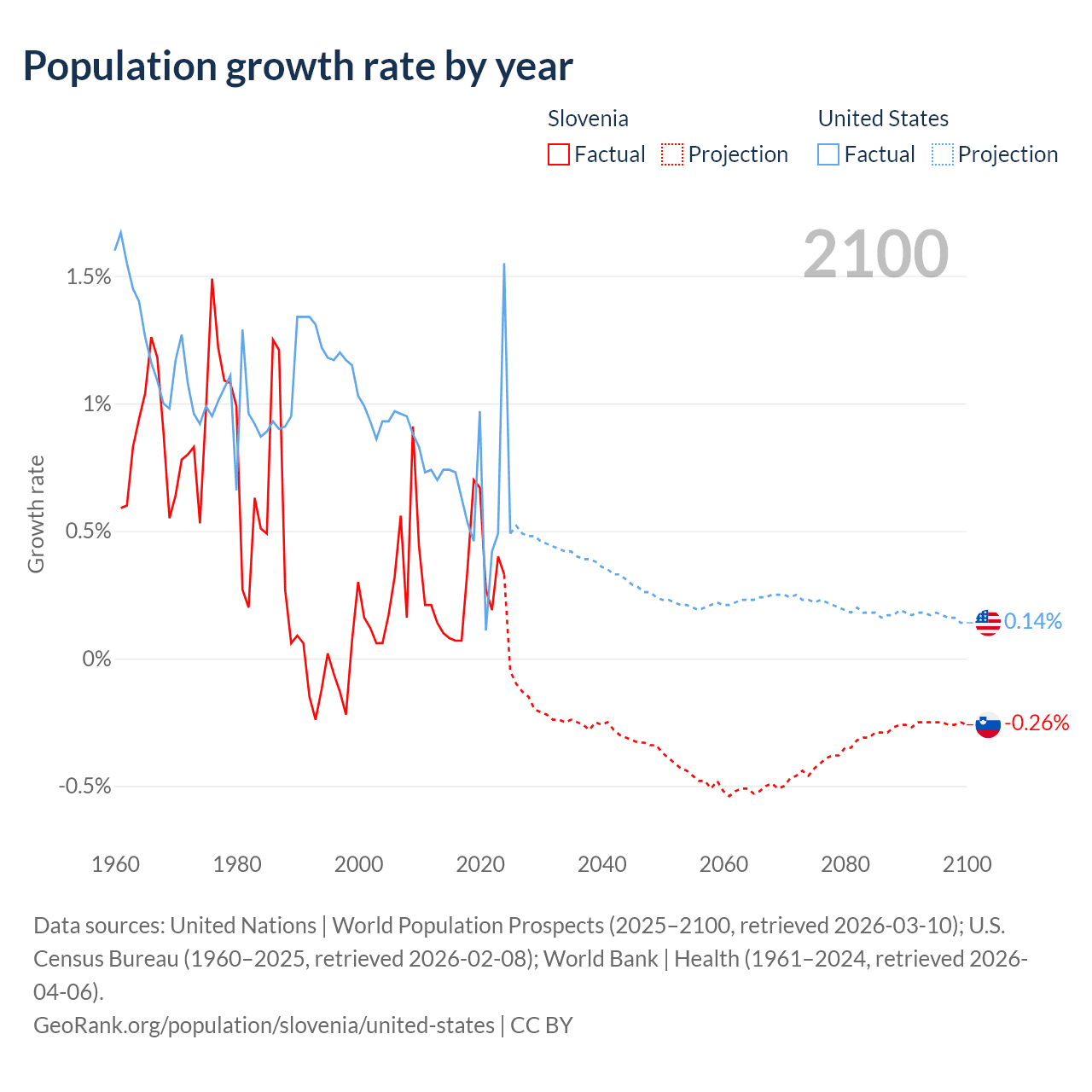 - For the last 10 years, Slovenia has had an average growth rate of +0.29% per year vs +0.65% in the United States.