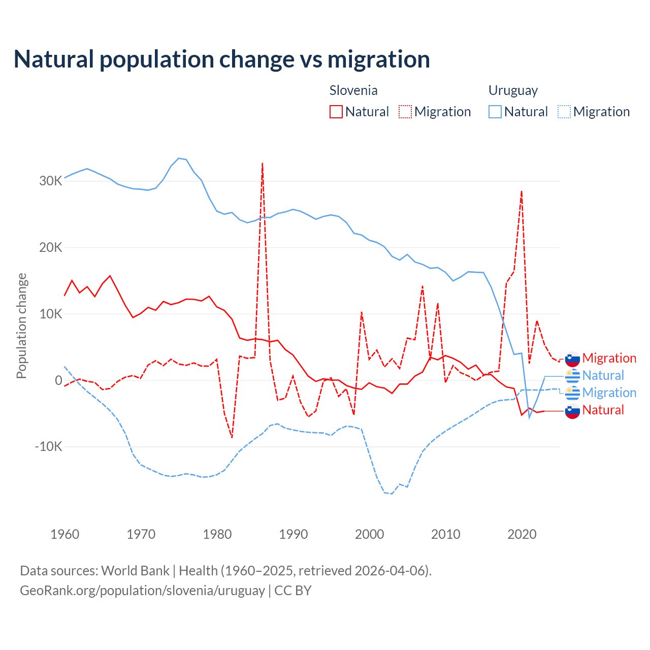 Over the last 10 years, 18.1% of the population change in Slovenia is from natural causes (a loss of 17,573 people) and 81.9% is from migration (a gain of 79,532 people). In Uruguay 70% is from natural causes (a gain of 64,303 people) and 30% is from migration (a loss of 27,501 people).