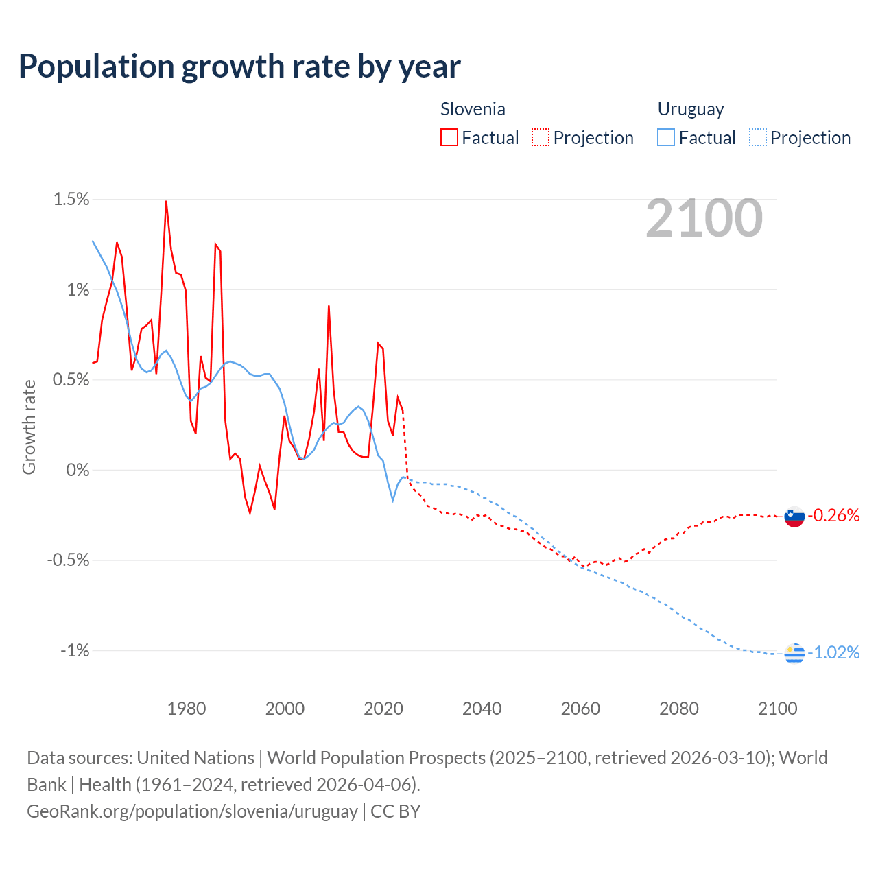 - For the last 10 years, Slovenia has had an average growth rate of +0.29% per year vs +0.11% in Uruguay.