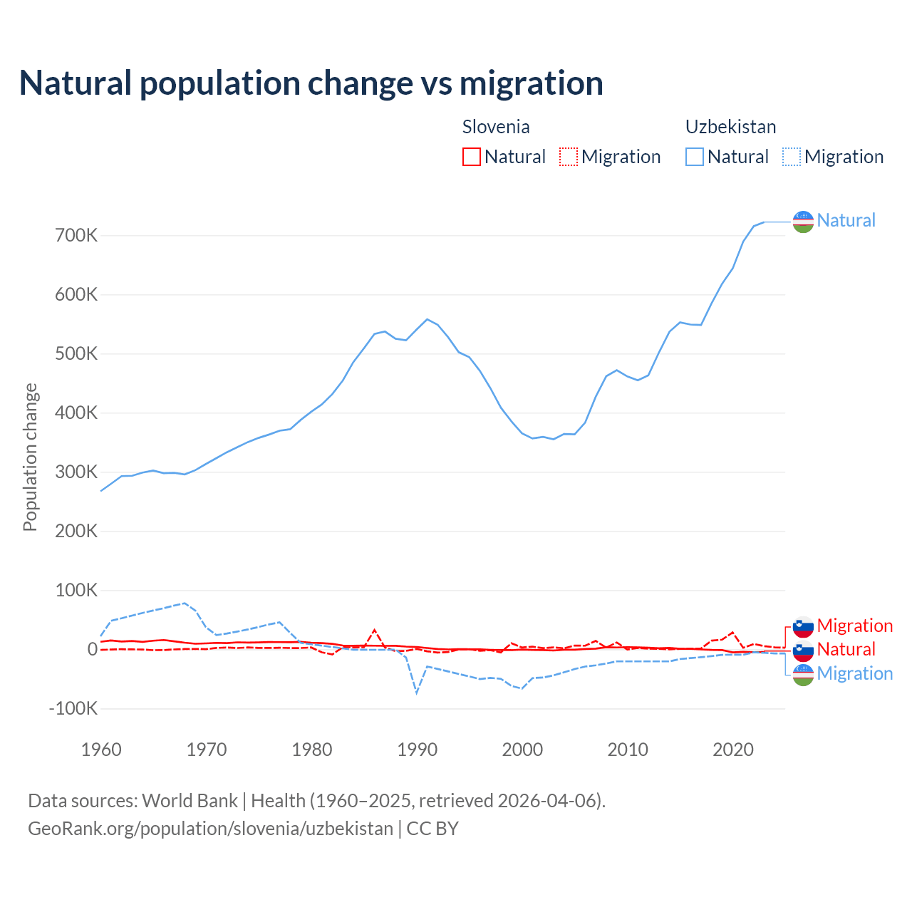Over the last 10 years, 18.1% of the population change in Slovenia is from natural causes (a loss of 17,573 people) and 81.9% is from migration (a gain of 79,532 people). In Uzbekistan 98.2% is from natural causes (a gain of 6,161,117 people) and 1.84% is from migration (a loss of 115,398 people).