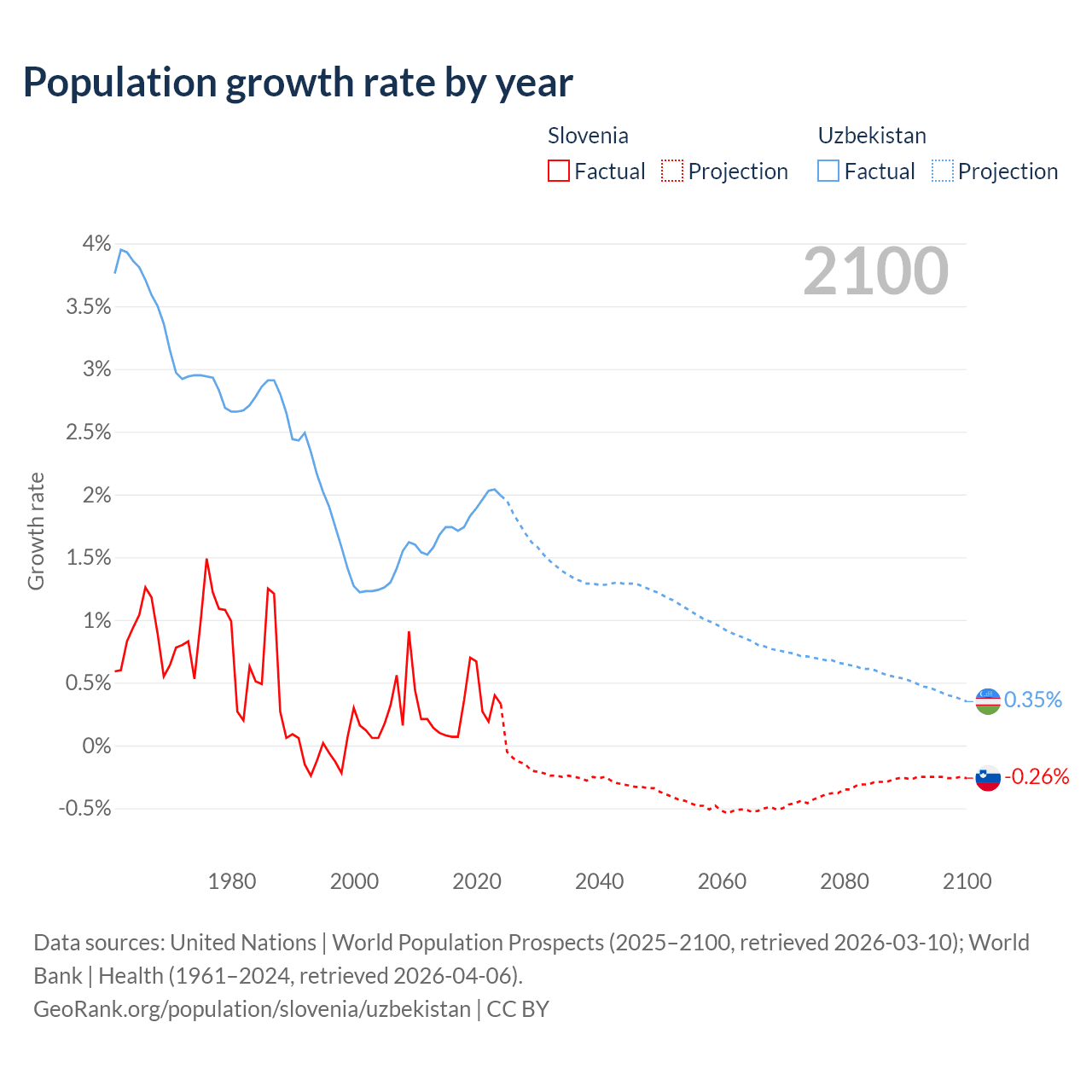 - For the last 10 years, Slovenia has had an average growth rate of +0.29% per year vs +1.85% in Uzbekistan.