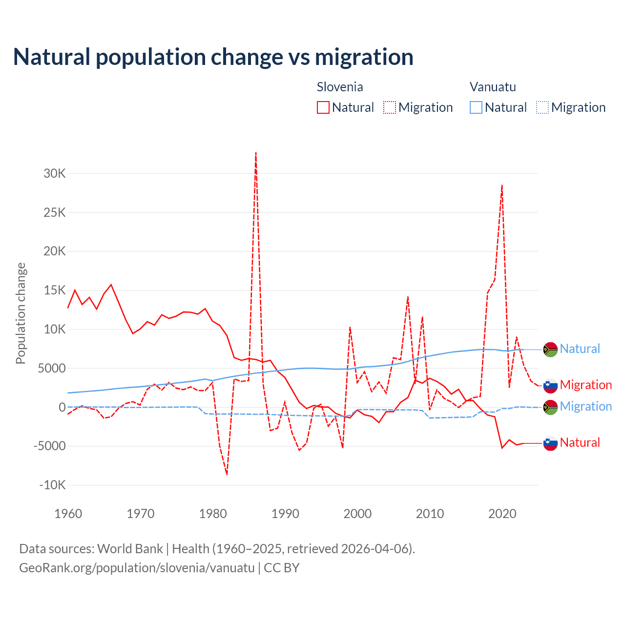 Over the last 10 years, 18.1% of the population change in Slovenia is from natural causes (a loss of 17,573 people) and 81.9% is from migration (a gain of 79,532 people). In Vanuatu 92.2% is from natural causes (a gain of 72,941 people) and 7.81% is from migration (a loss of 6,181 people).