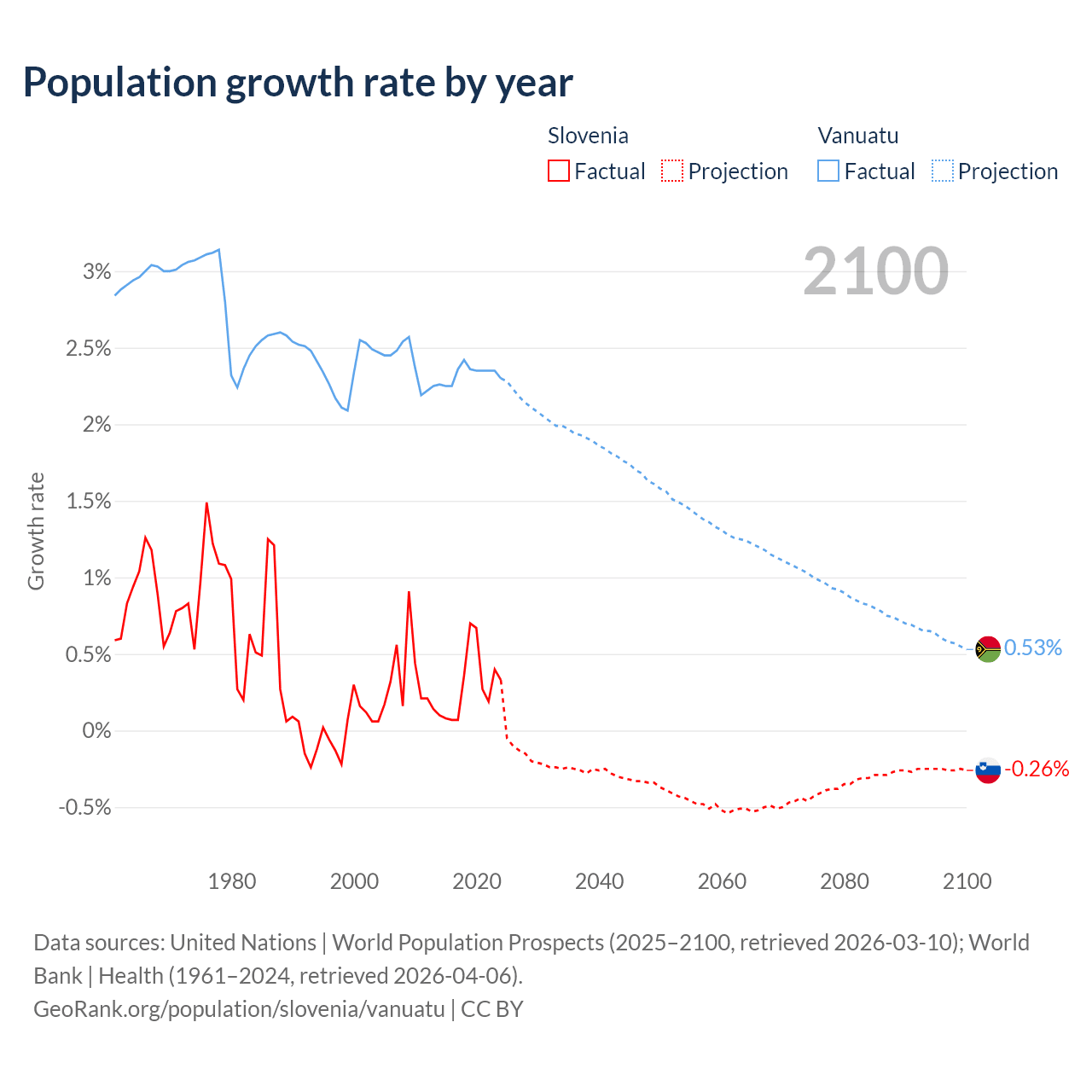 - For the last 10 years, Slovenia has had an average growth rate of +0.29% per year vs +2.33% in Vanuatu.