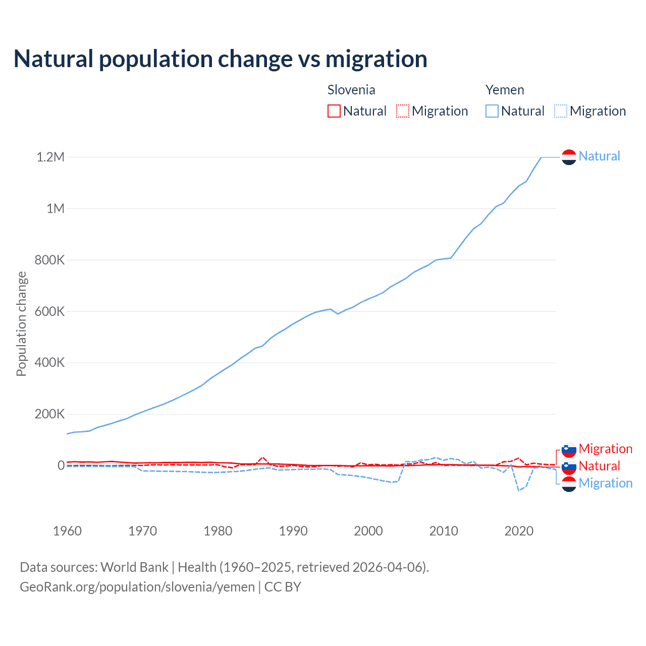 Over the last 10 years, 18.1% of the population change in Slovenia is from natural causes (a loss of 17,573 people) and 81.9% is from migration (a gain of 79,532 people). In Yemen 97.8% is from natural causes (a gain of 10,460,813 people) and 2.17% is from migration (a loss of 231,814 people).