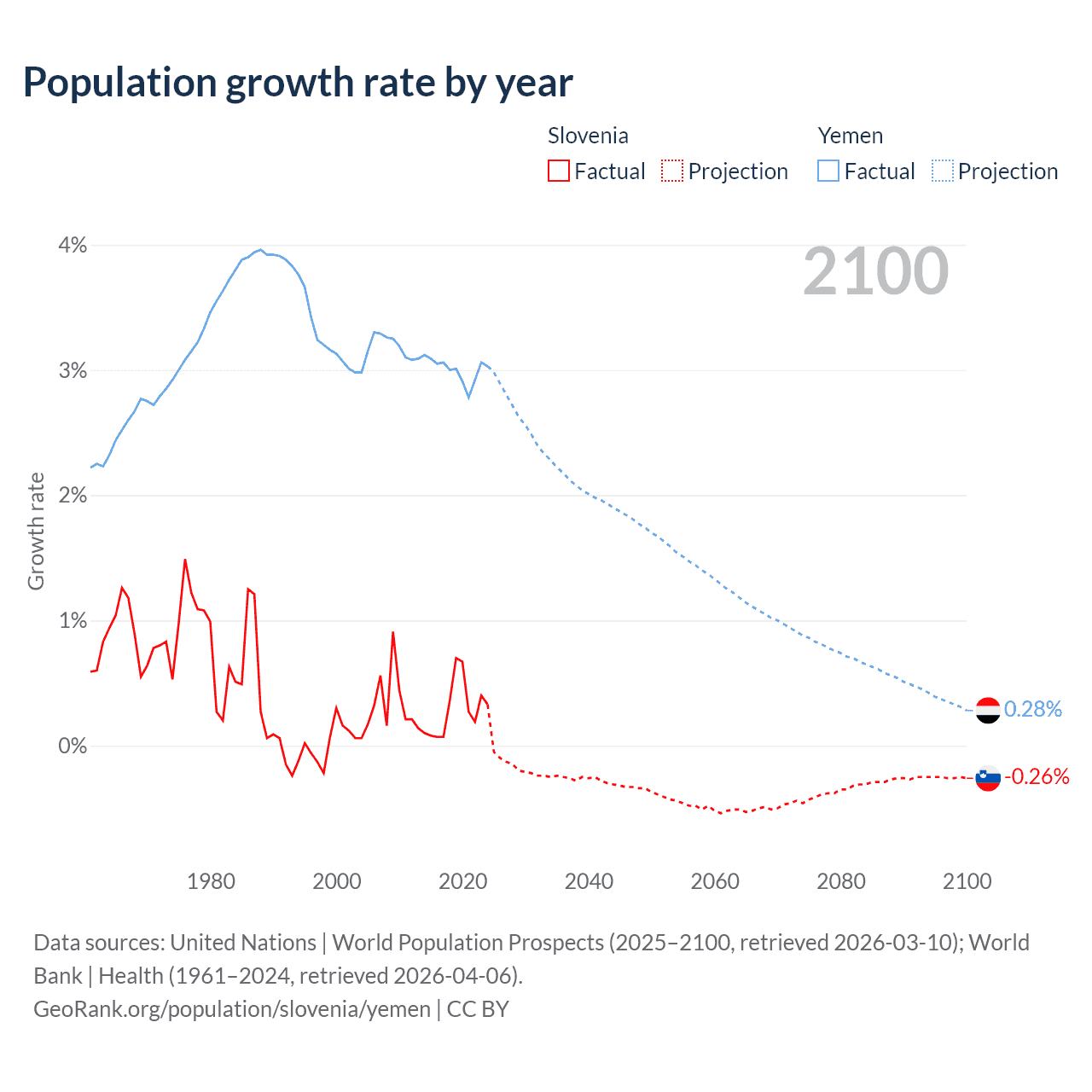 - For the last 10 years, Slovenia has had an average growth rate of +0.29% per year vs +3% in Yemen.