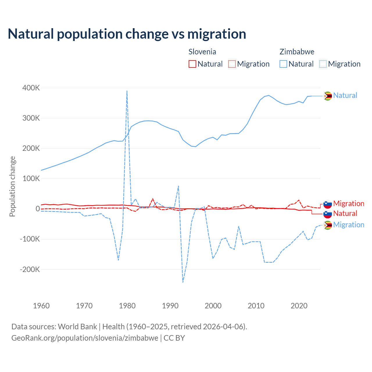 Over the last 10 years, 18.1% of the population change in Slovenia is from natural causes (a loss of 17,573 people) and 81.9% is from migration (a gain of 79,532 people). In Zimbabwe 74.9% is from natural causes (a gain of 3,558,487 people) and 25.1% is from migration (a loss of 1,192,807 people).