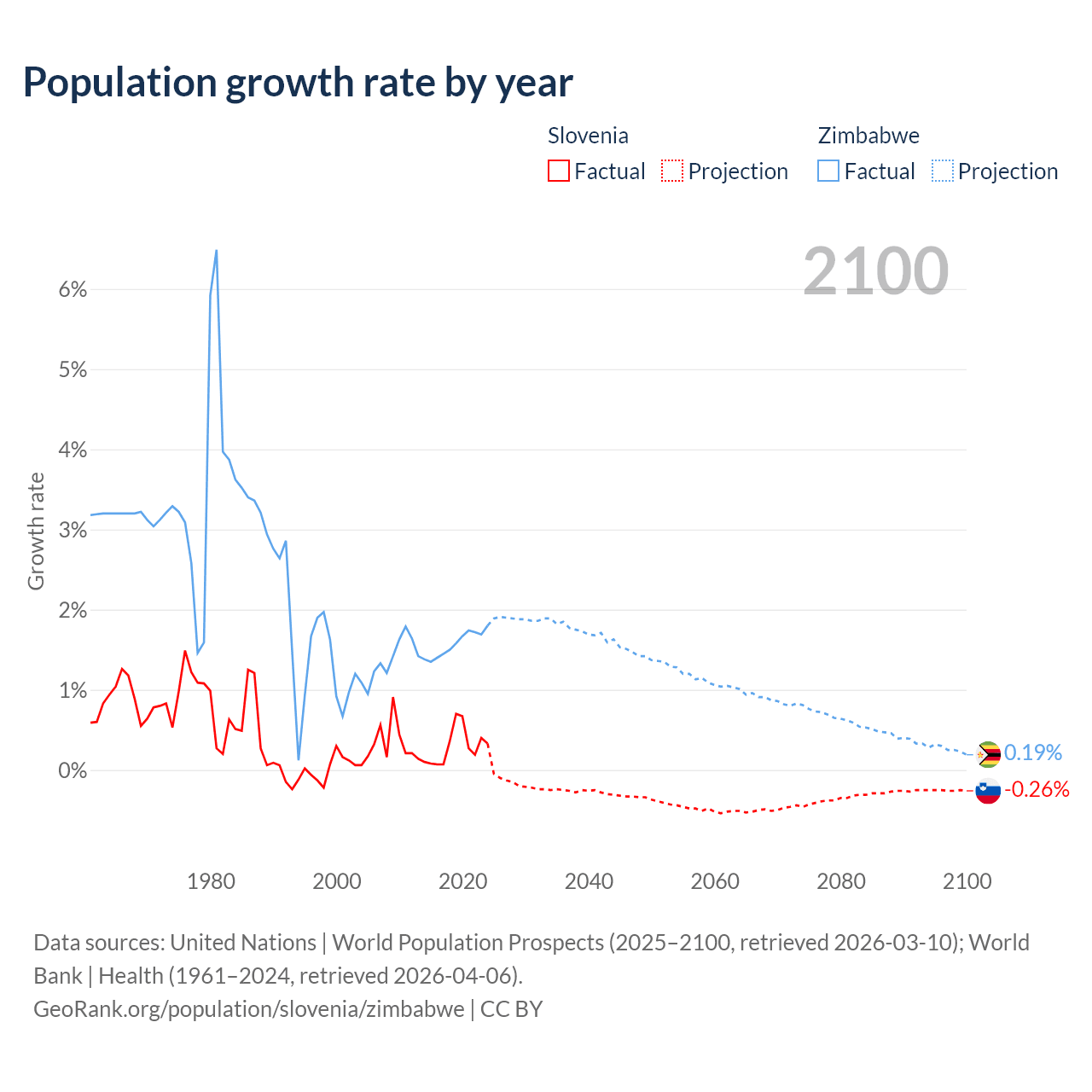 - For the last 10 years, Slovenia has had an average growth rate of +0.29% per year vs +1.57% in Zimbabwe.