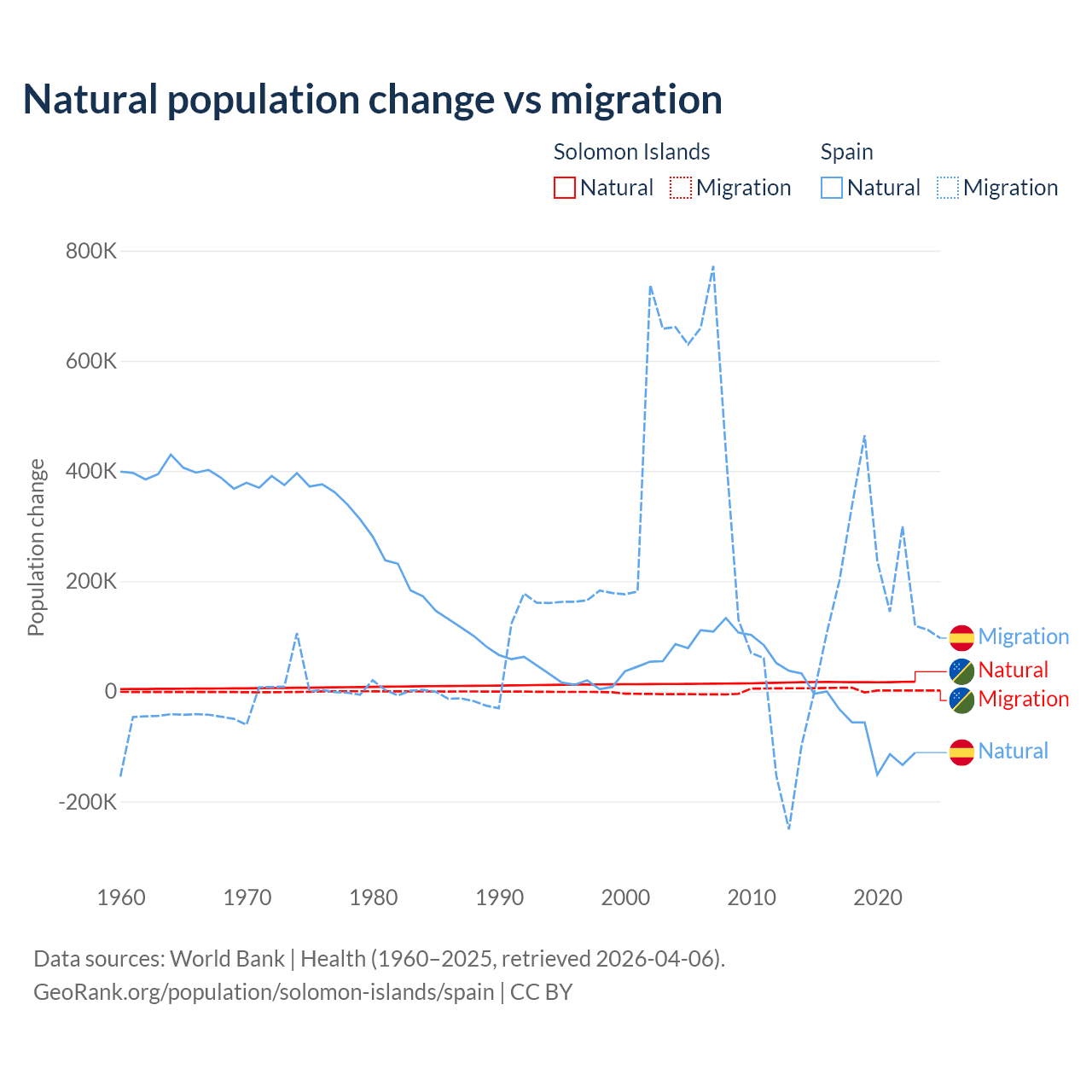 Over the last 10 years, 82.8% of the population change in the Solomon Islands is from natural causes (a gain of 168,727 people) and 17.2% is from migration (a gain of 35,031 people). In Spain 25.8% is from natural causes (a loss of 627,829 people) and 74.2% is from migration (a gain of 1,810,127 people).