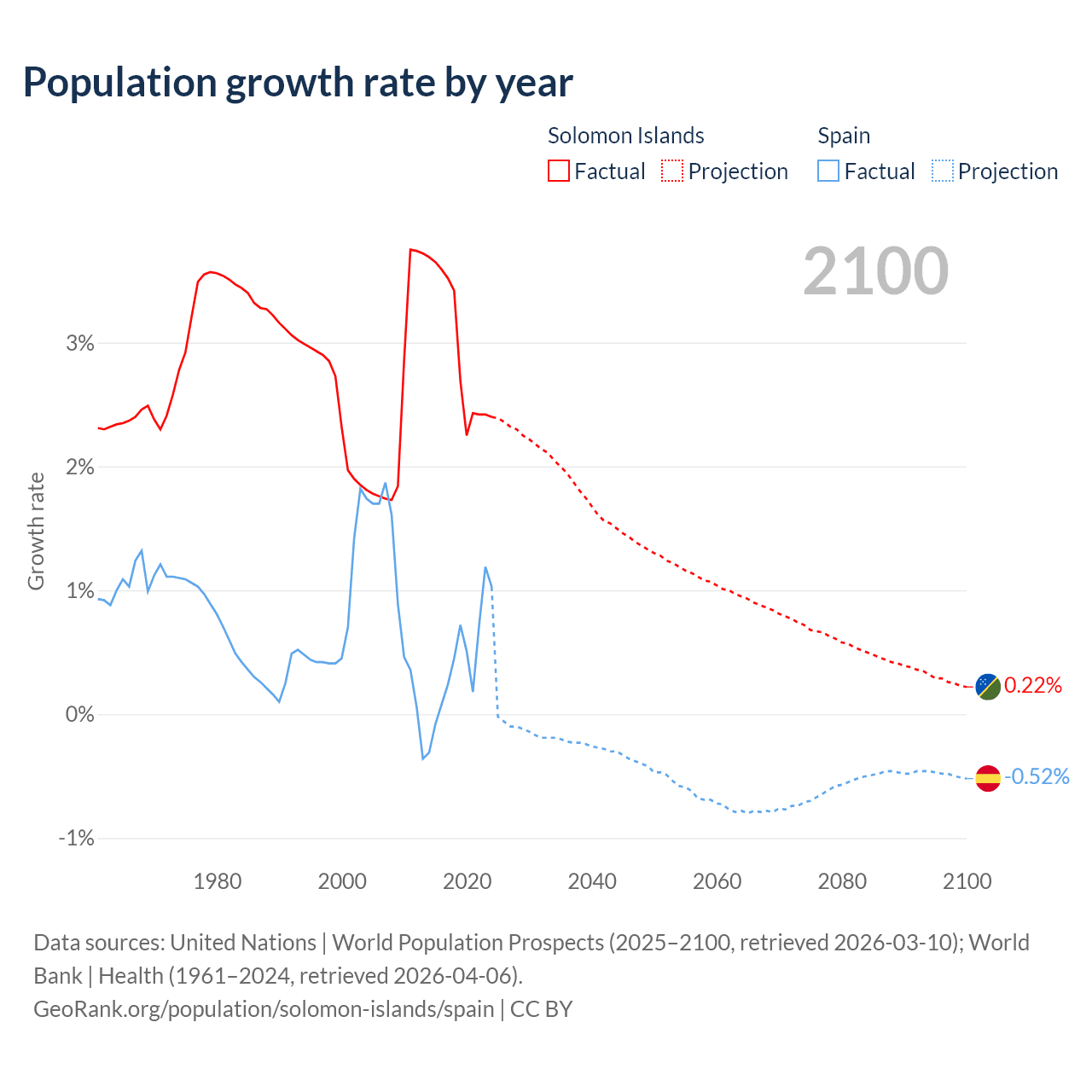- For the last 10 years, the Solomon Islands has had an average growth rate of +2.95% per year vs +0.43% in Spain.